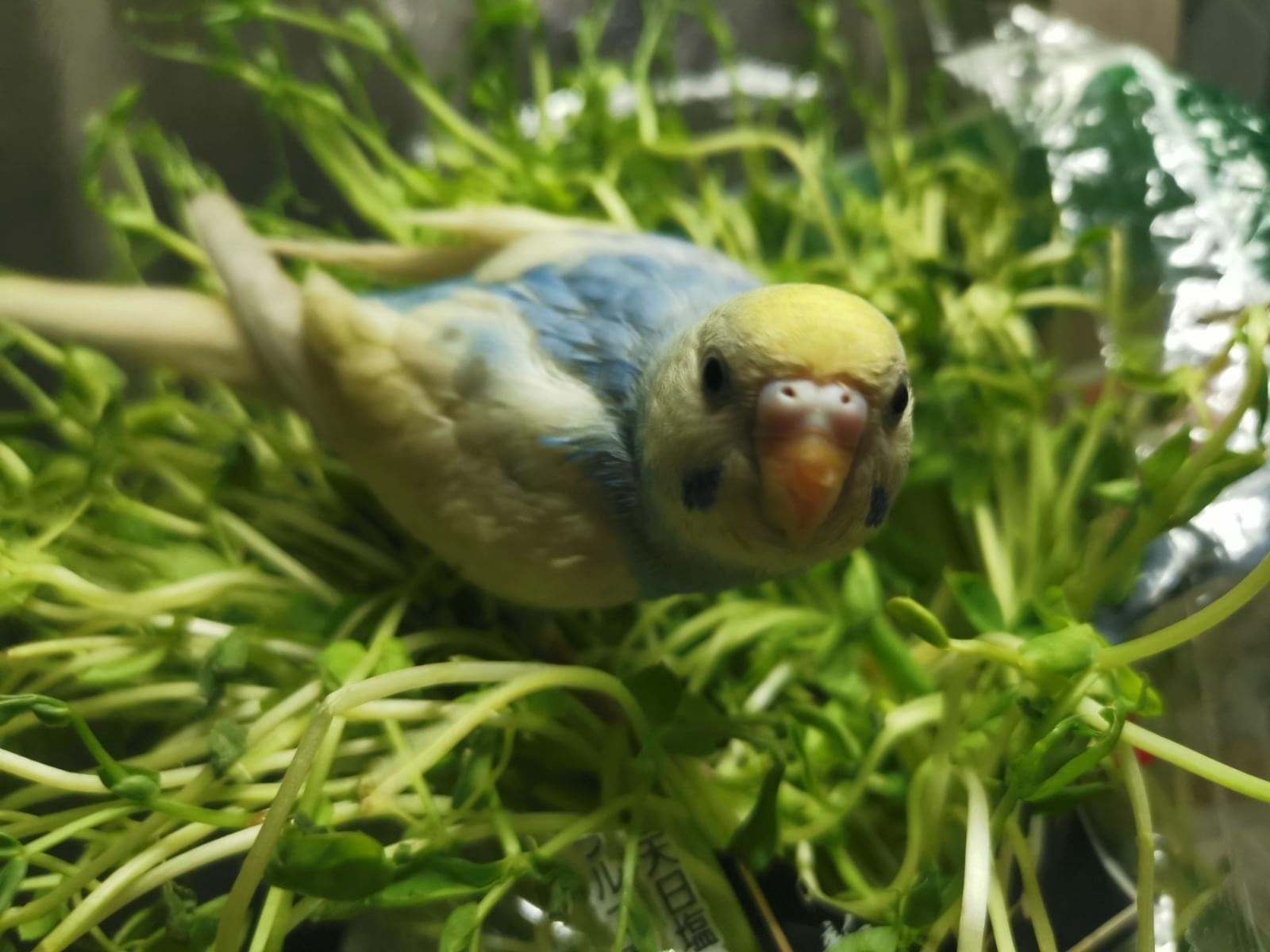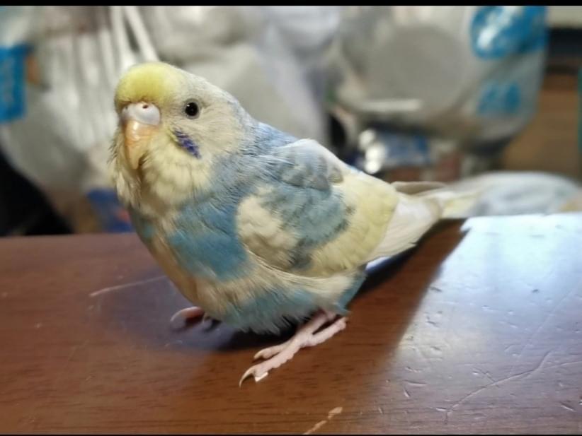 頭と羽がクリーム色、お腹は水色と白、背中は水色のセキセイインコを探しています。
