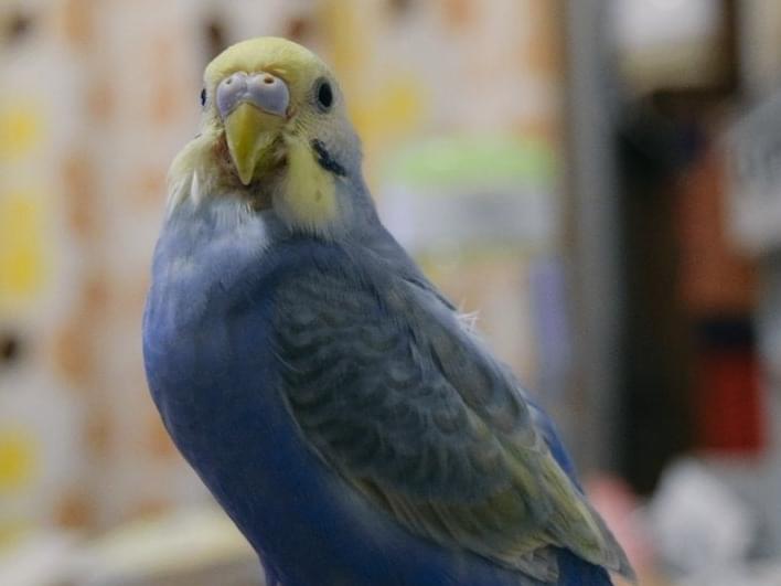 頭は黄色で、胴体が水色、ところどころ灰色がかっています。