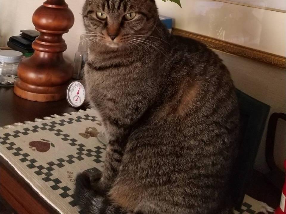 キジトラ猫、鼻のさきとお腹は茶色、尾っぽは長いほうで、5キロぐらいの成猫です。