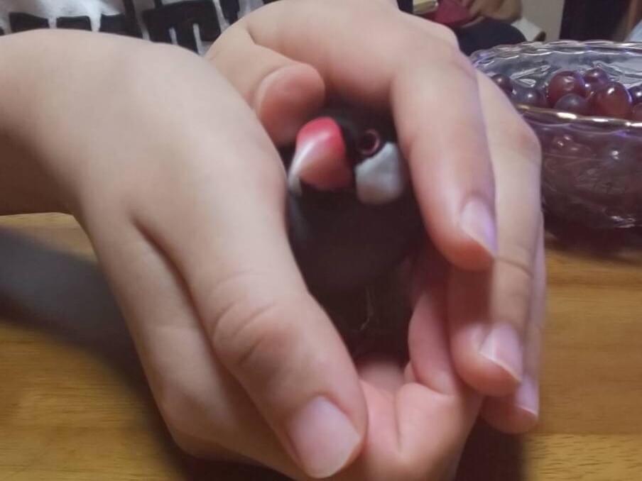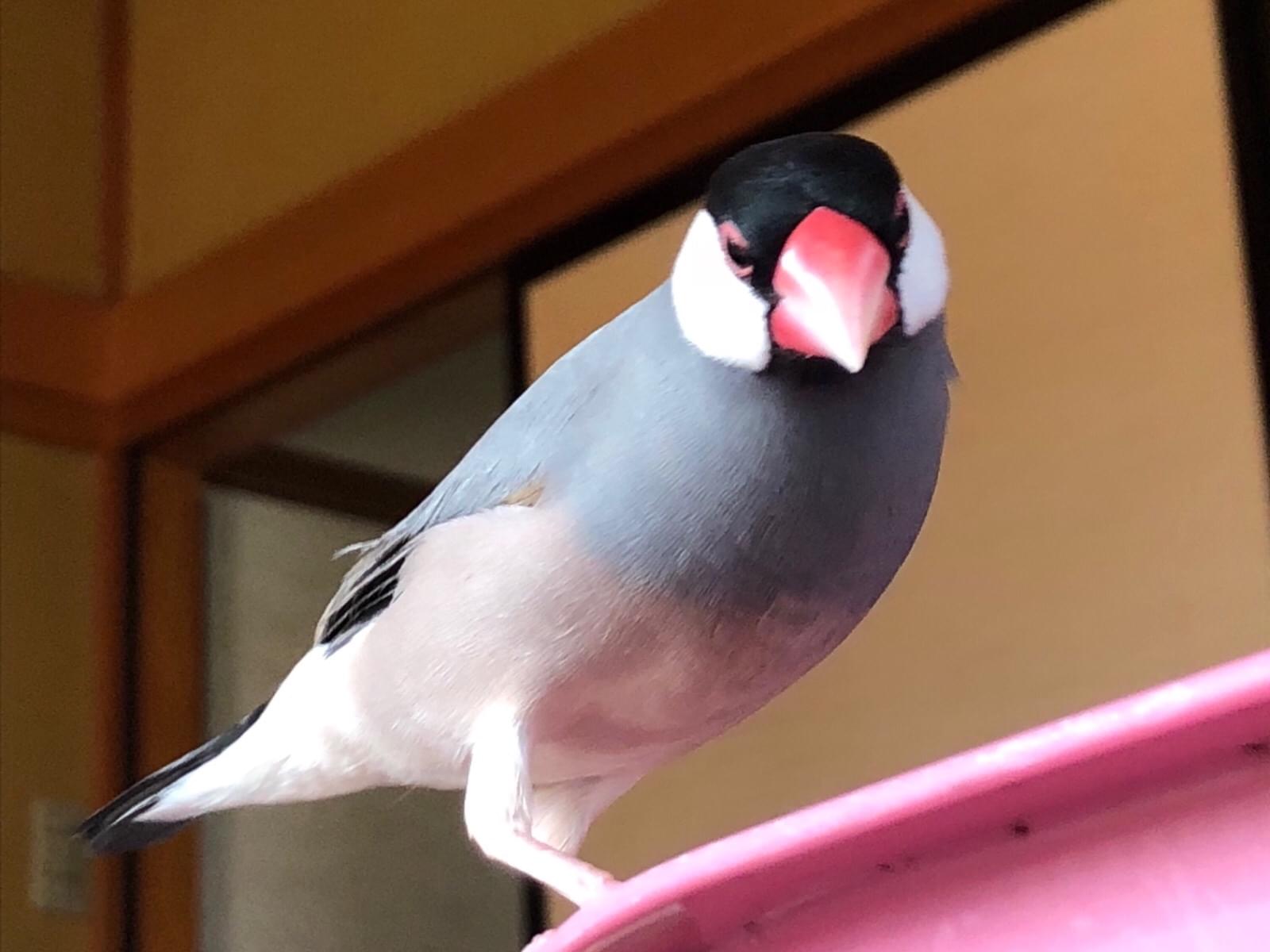 目の縁が赤いオスです。人懐こく手に乗ります。飼い主が「ちーちゃん」と呼ぶと強く叫ぶように鳴きます。神経質ですぐに驚きます。爪を切るのが苦手で嫌がるため、爪は長めです。