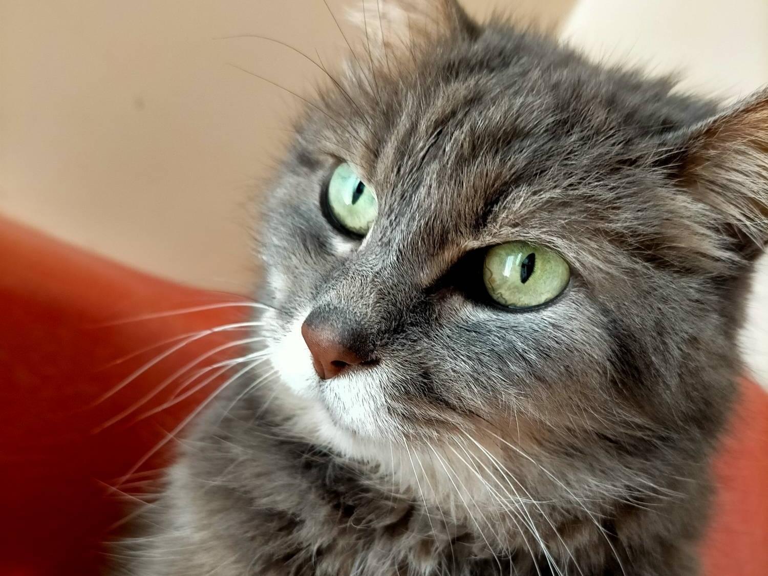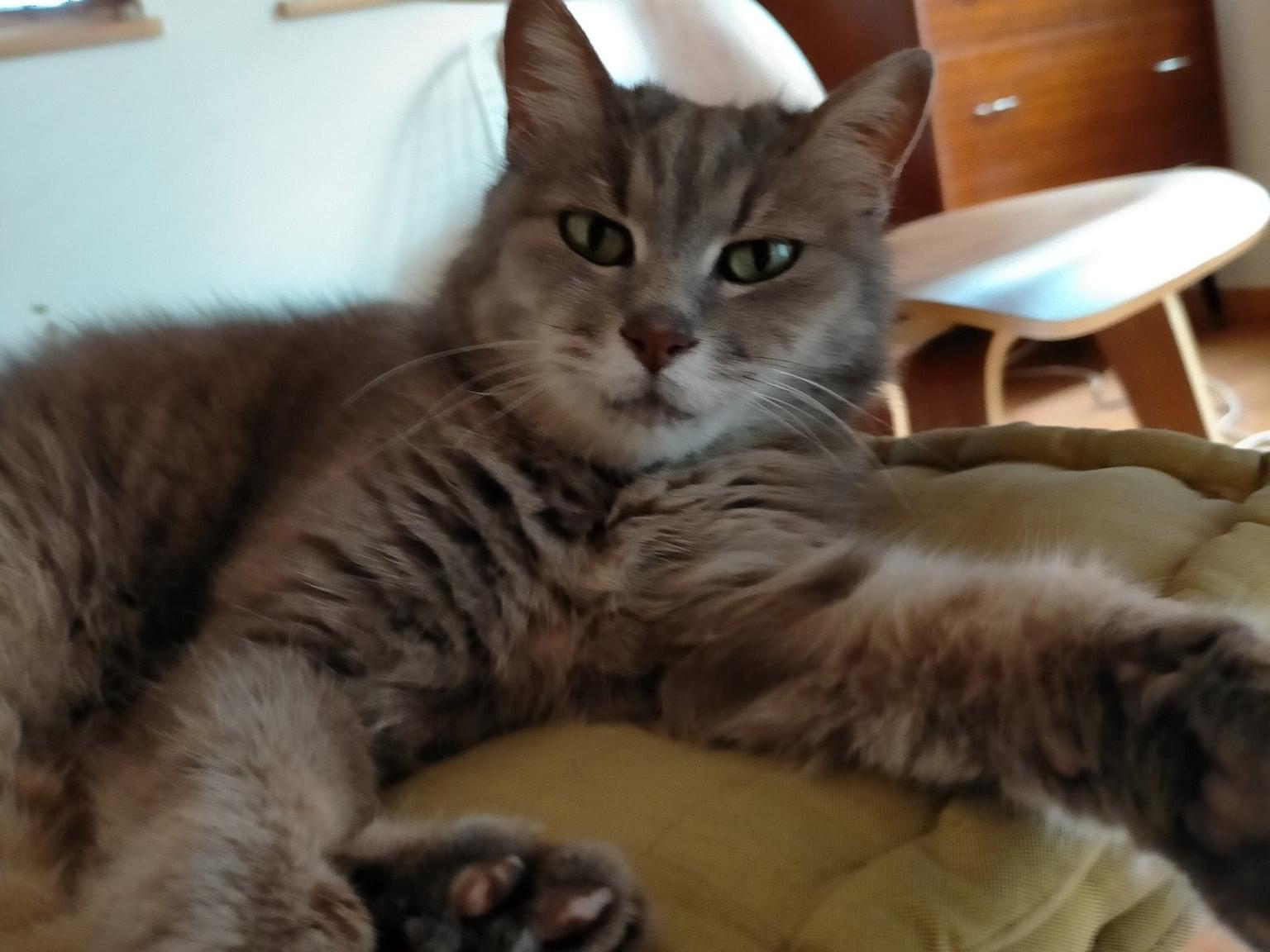 半長毛、口元が白で、身体はグレー、茶色などが混ざった外国猫のような毛並みです