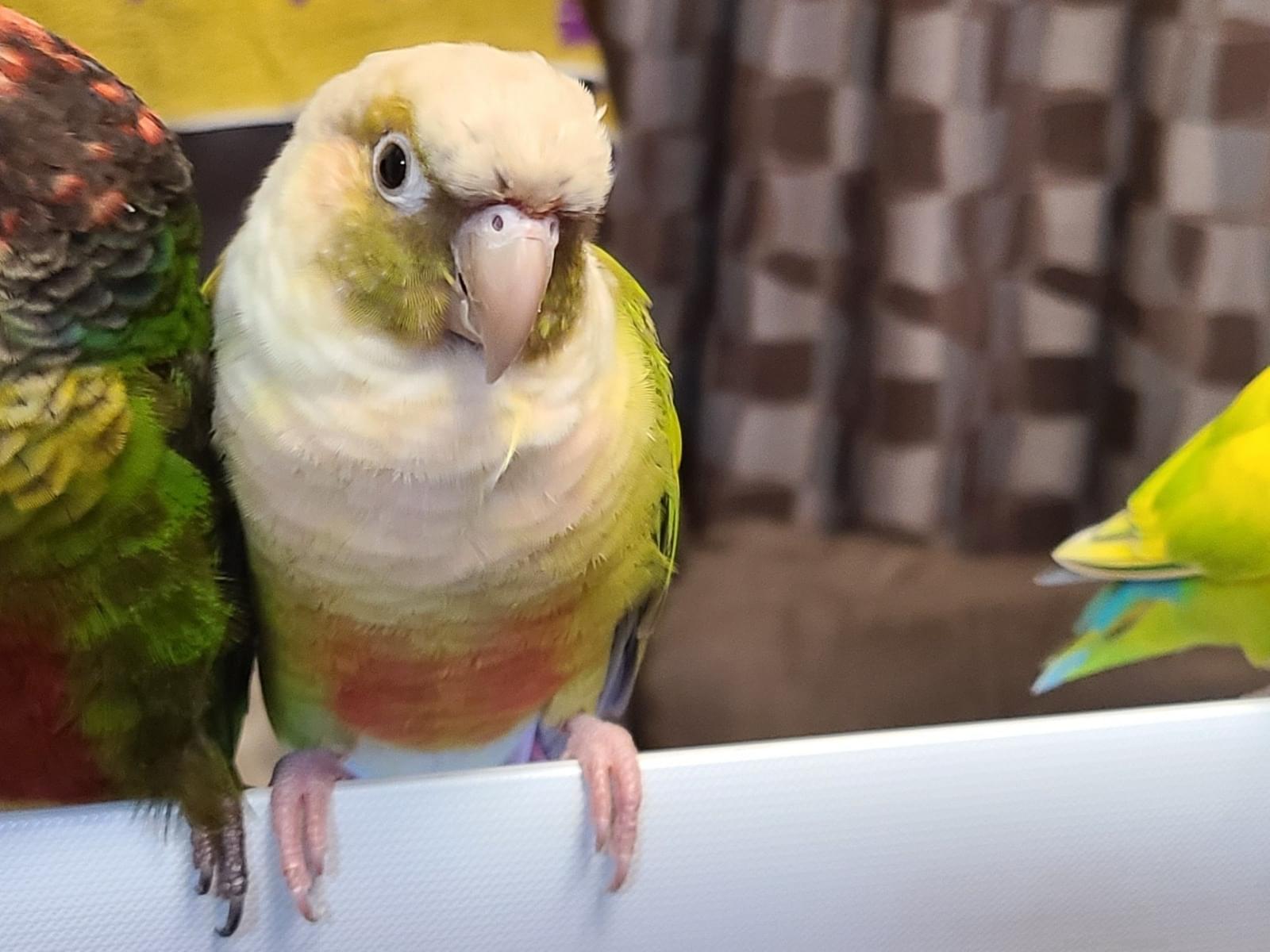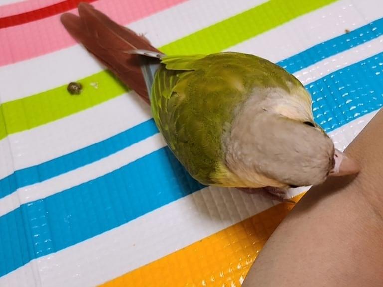 シナモンカラー(頭ベージュ、背中緑、お腹オレンジ、尻尾赤)