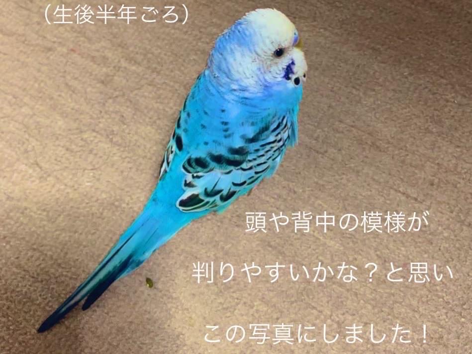 全体的に青色ですが、頭は白っぽく、首の後ろ?は水色のグラデーションです。