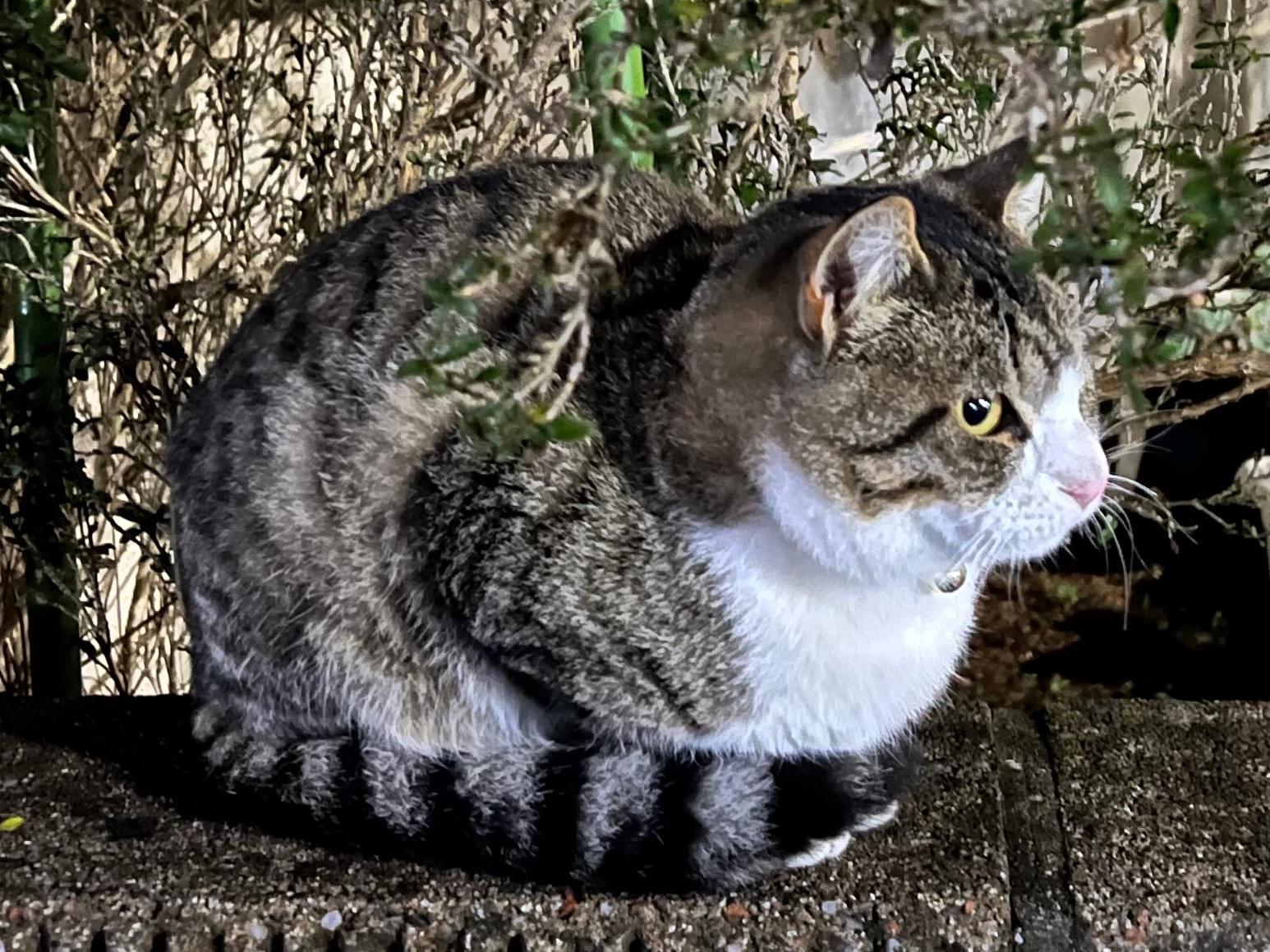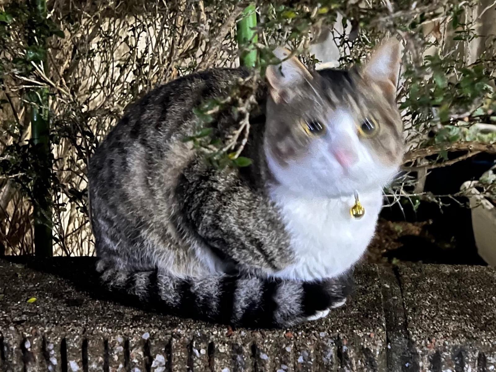 鈴付きの首輪をしたキジ白ちゃんを見かけました