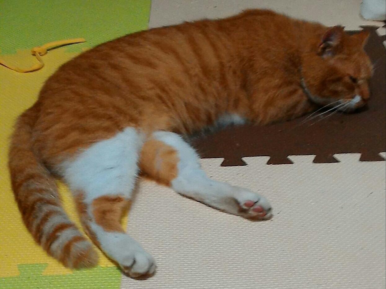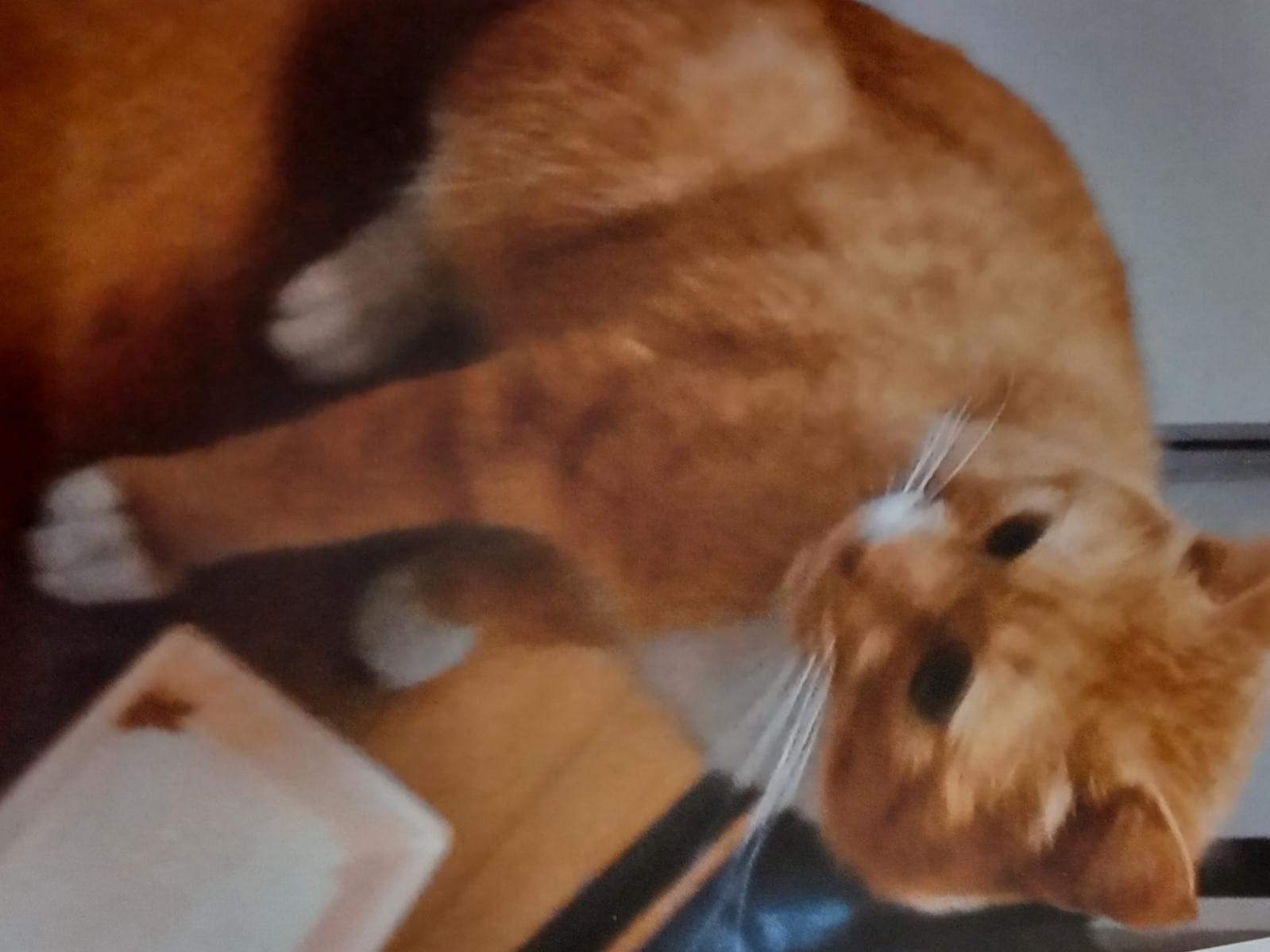 大きな茶トラ(お腹→白)しっぽ長い♂ほぼ茶トラ顔(右側髭の所→)前足→白手袋