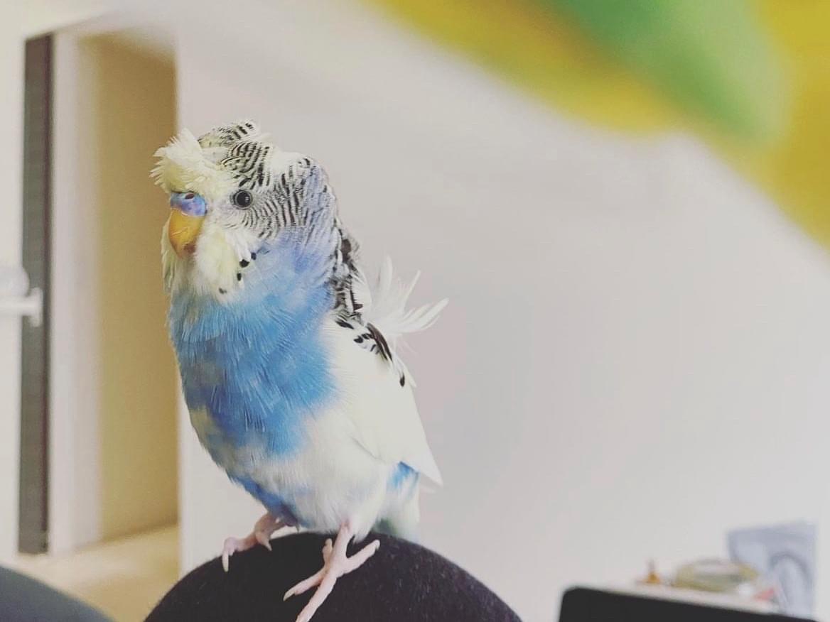 色は、白と青、黒い模様。羽衣セキセイなので、背中に特徴あり。臆病なので、身を潜めるタイプです。