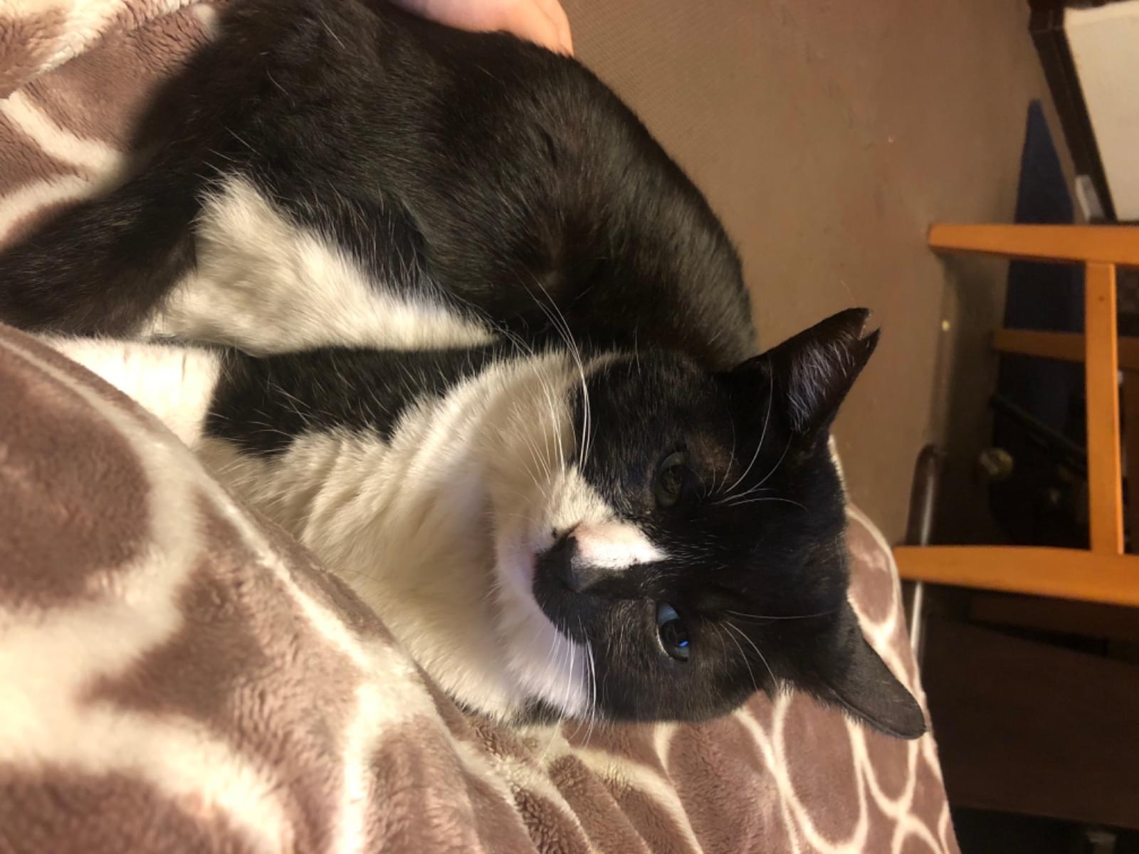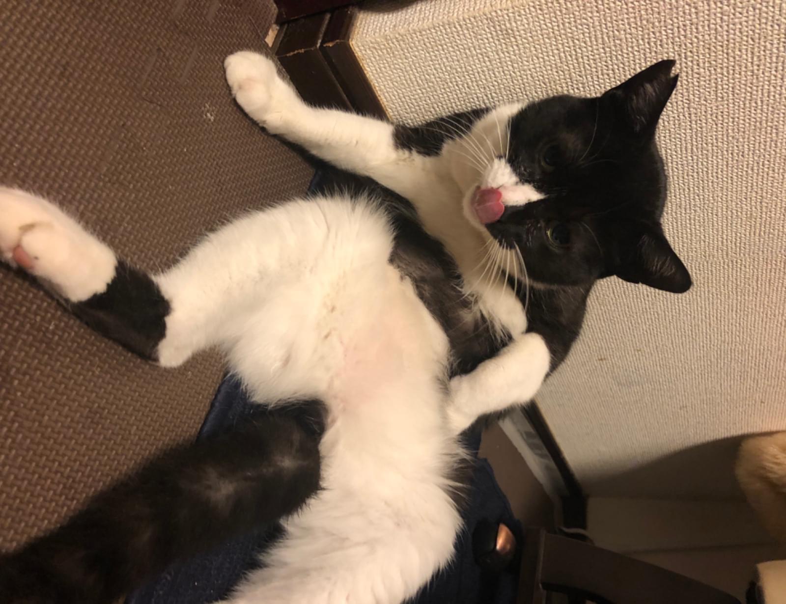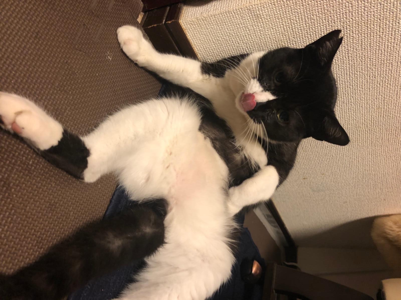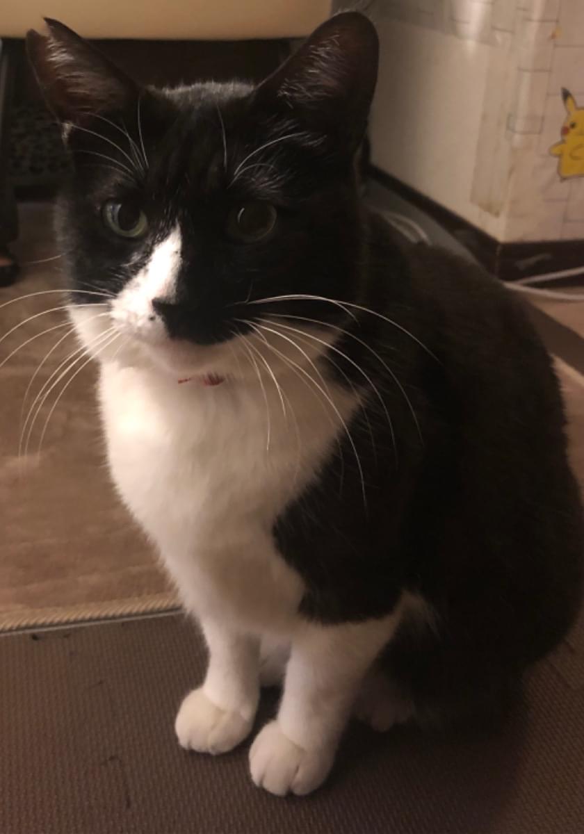 右耳カット済みの元野良の白黒ハチワレ猫です