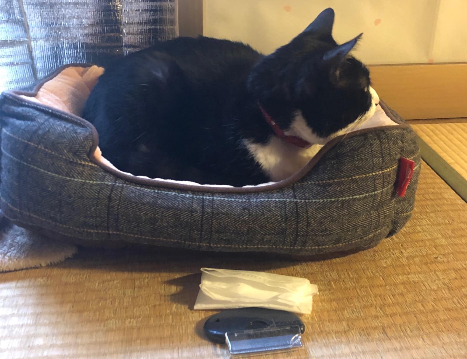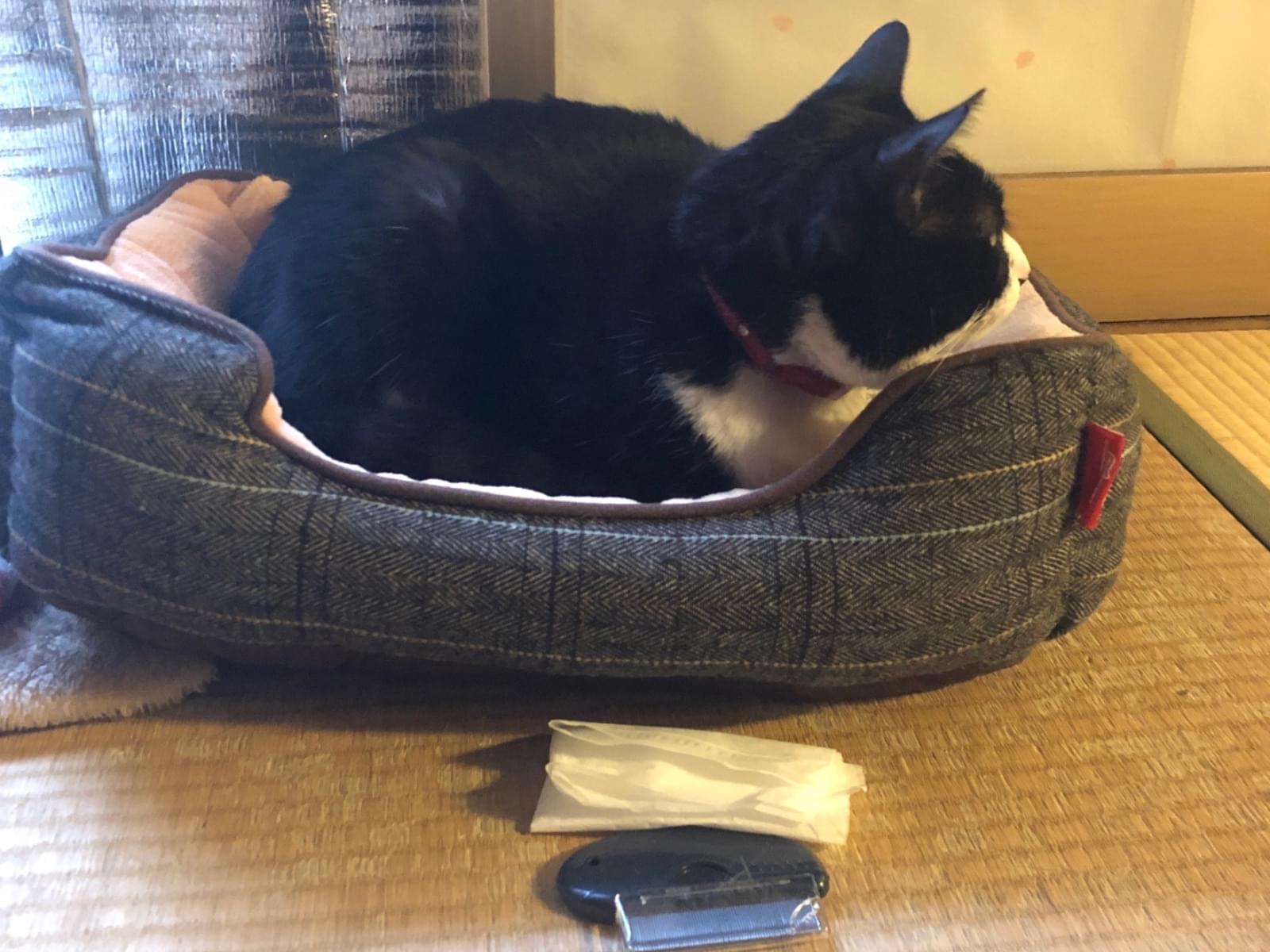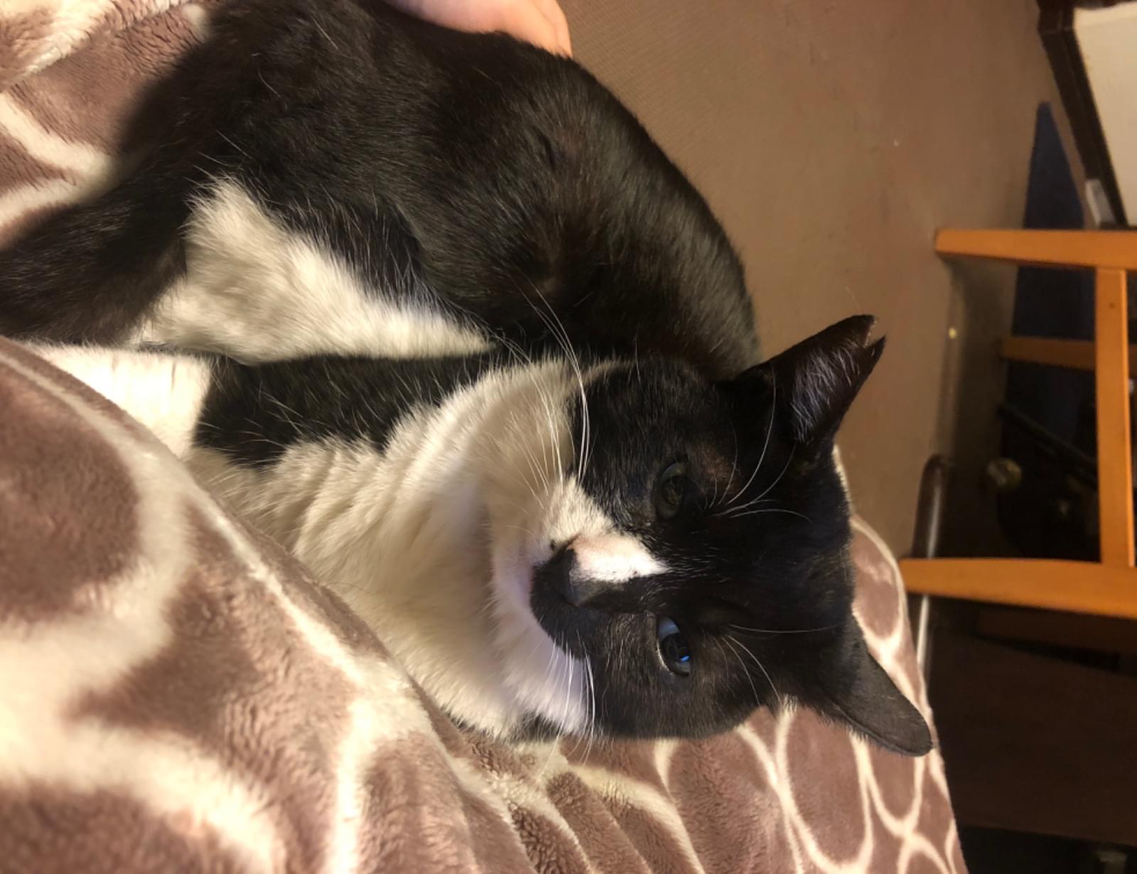 右耳カット済みの元野良の白黒ハチワレ猫です