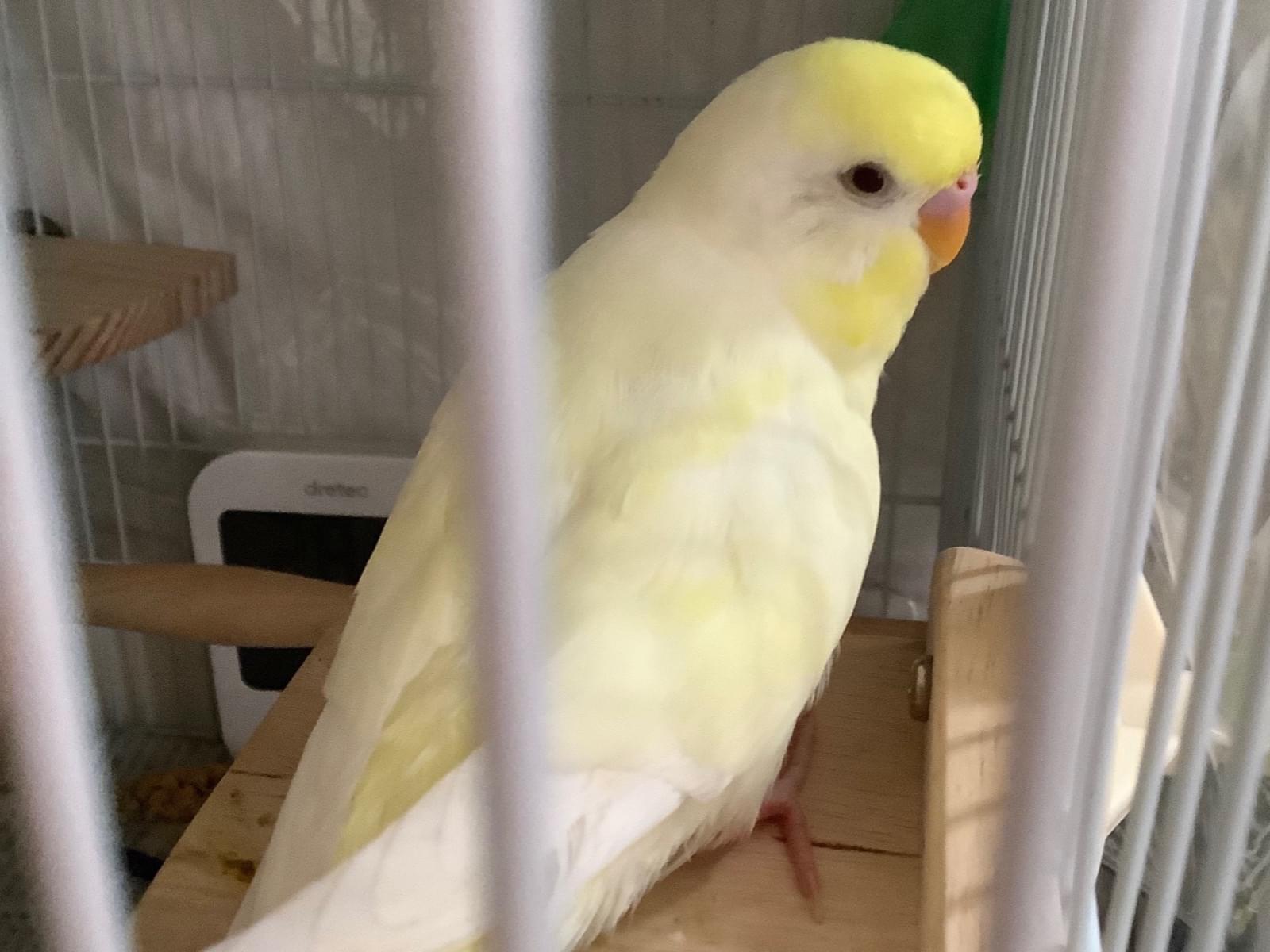 頭が黄色く、身体がクリーム色のセキセイインコです。
