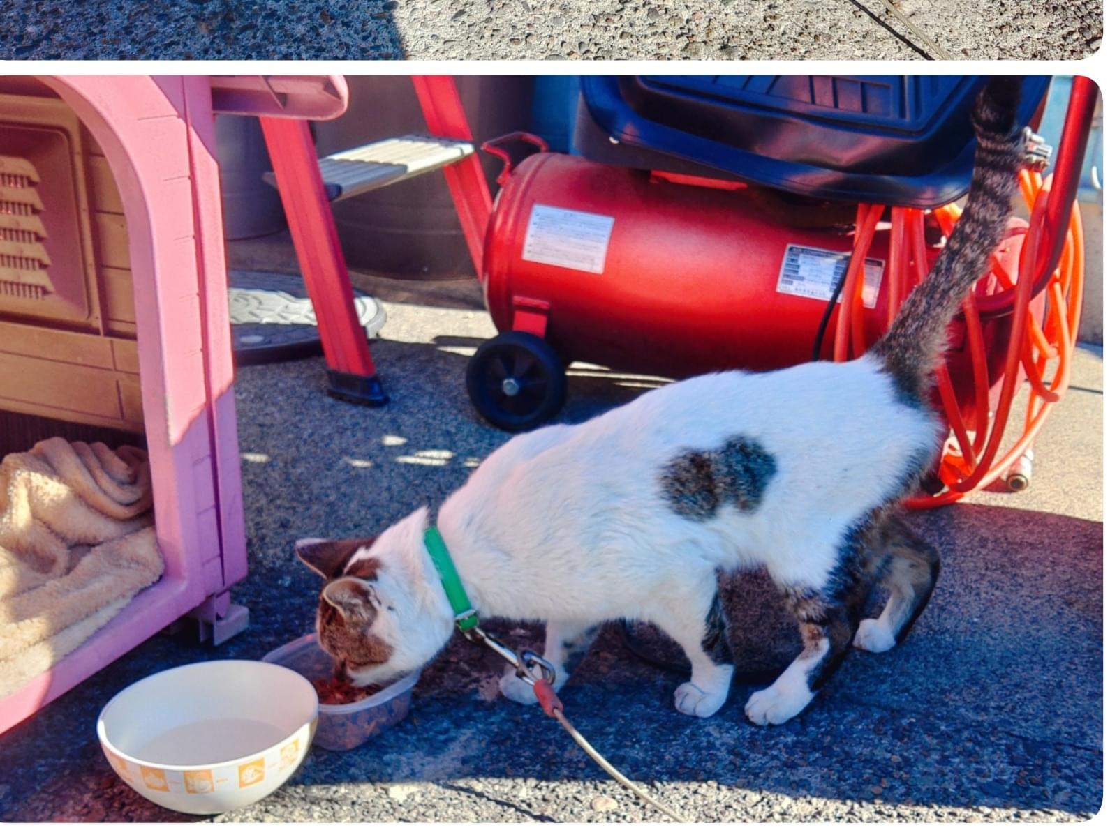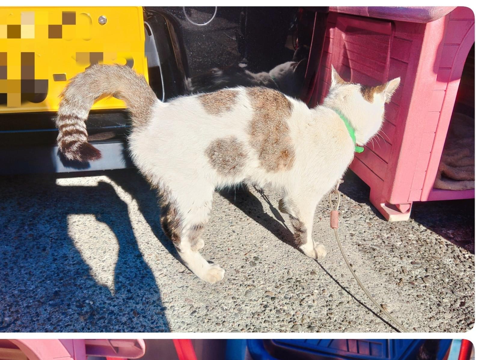 首輪等していませんでしたが、非常に人懐っこく、抱っこも嫌がらない、スリスリ寄ってくる子です。敷地内に迷い込んできました。よく鳴きます。白色ベースに特徴的な模様をしています。