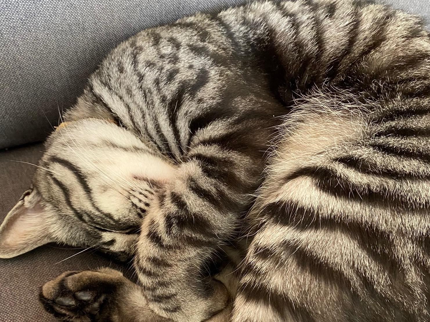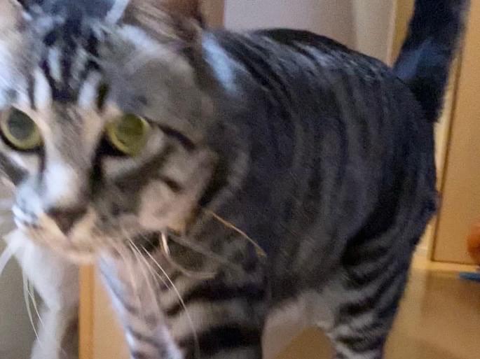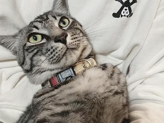 毛色は全体はグレーに黒模様、お腹は真っ白です。