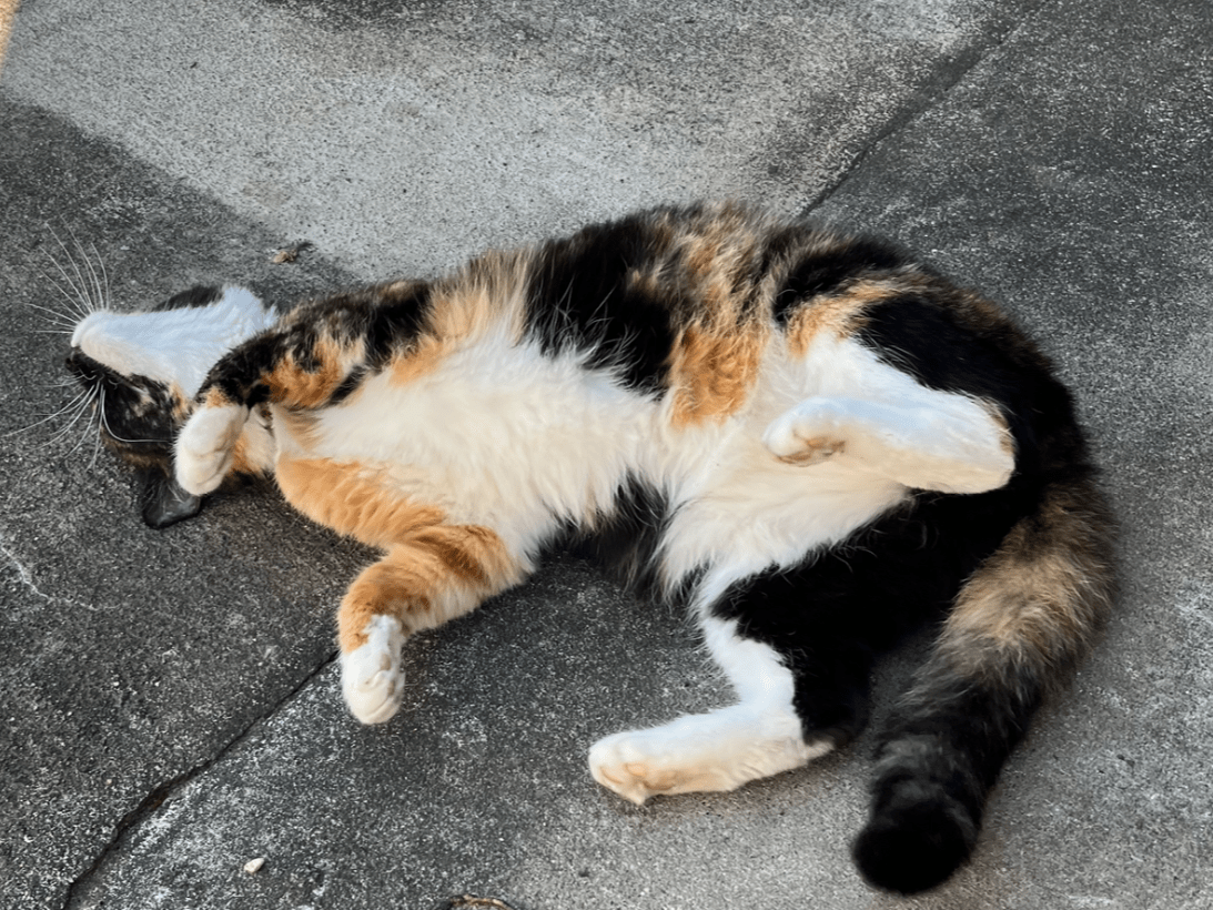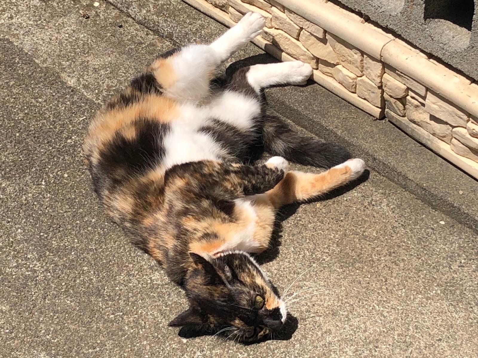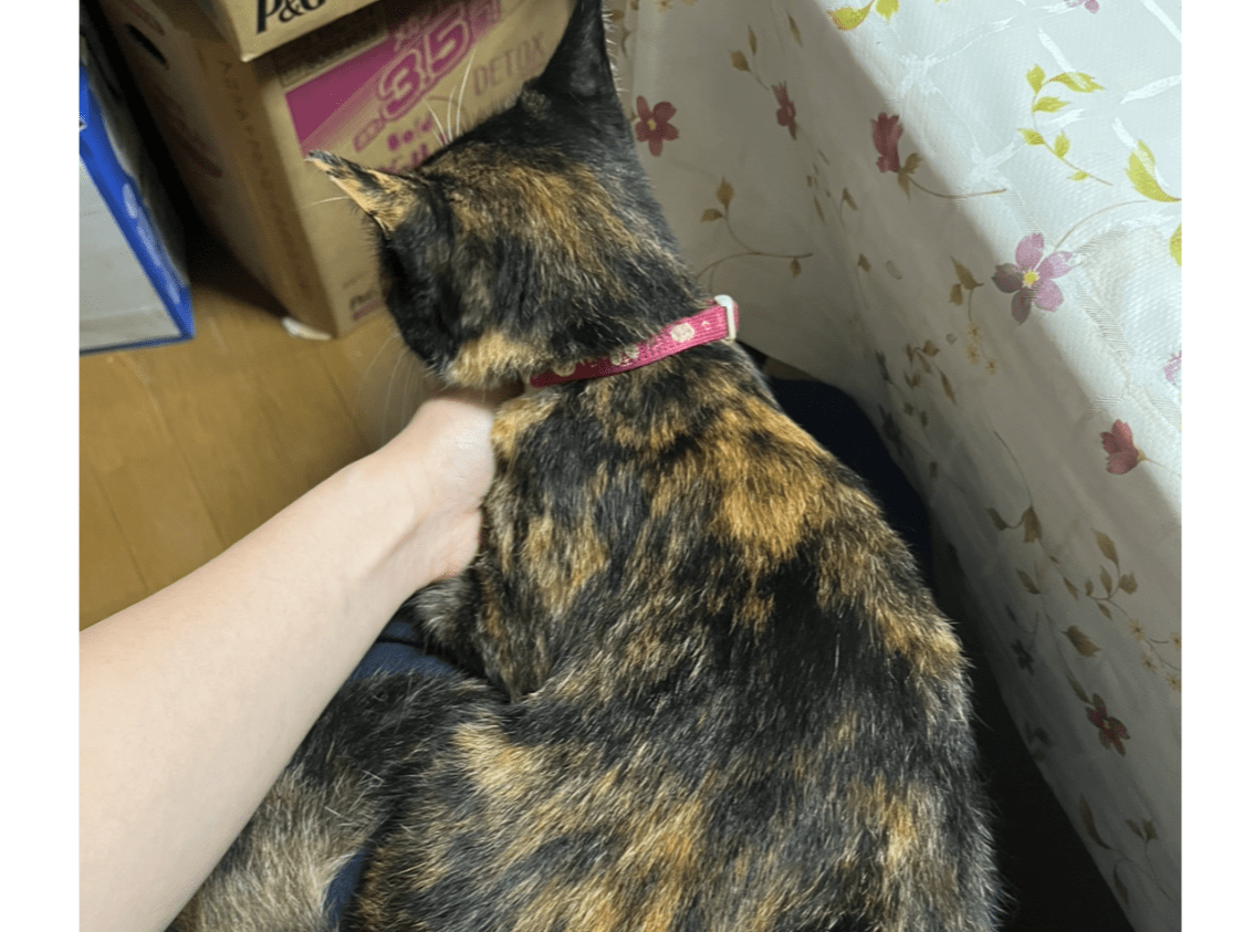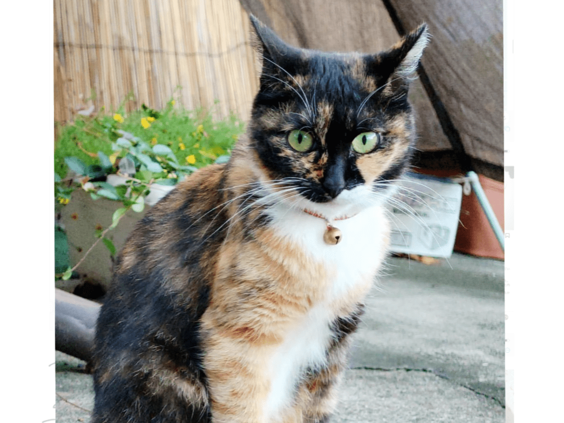 三毛猫で顎からお腹にかけては白く、足先も4足とも白。右前足は茶トラ柄。首輪は濃いピンクで鈴つき。小顔で下半身太り体型。あまり鳴くことはせず、鳴いたとしてもとても声が小さい。