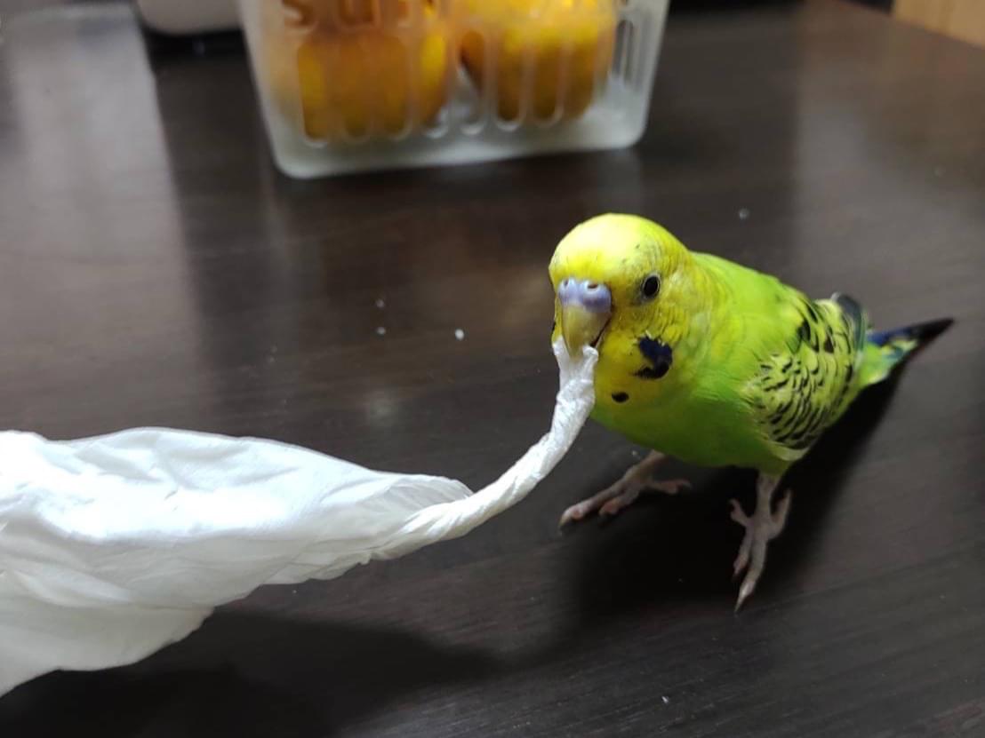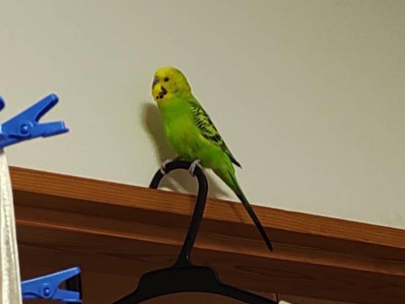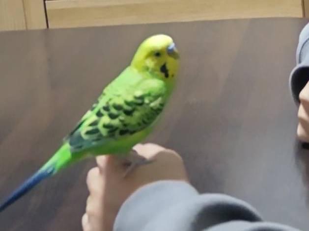 黄色い頭、黄緑の体で羽に黒混じりのセキセイインコです。少しお喋りをします。