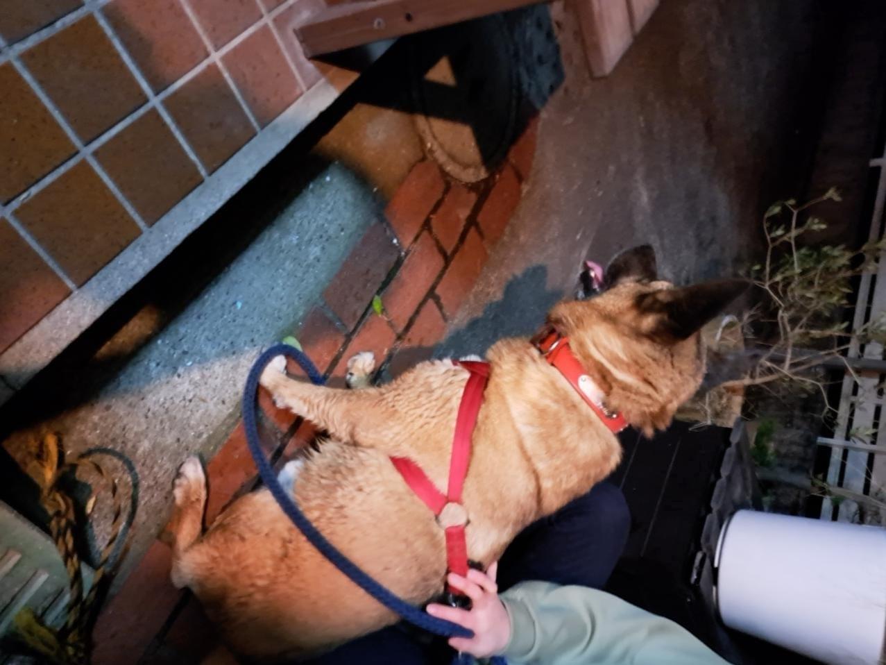 首輪とハーネスは赤でペティオのメーカー、リードは青、リードの先には黒と黄色の紐つきで下田三文字付近を走っているところ、保護しました。