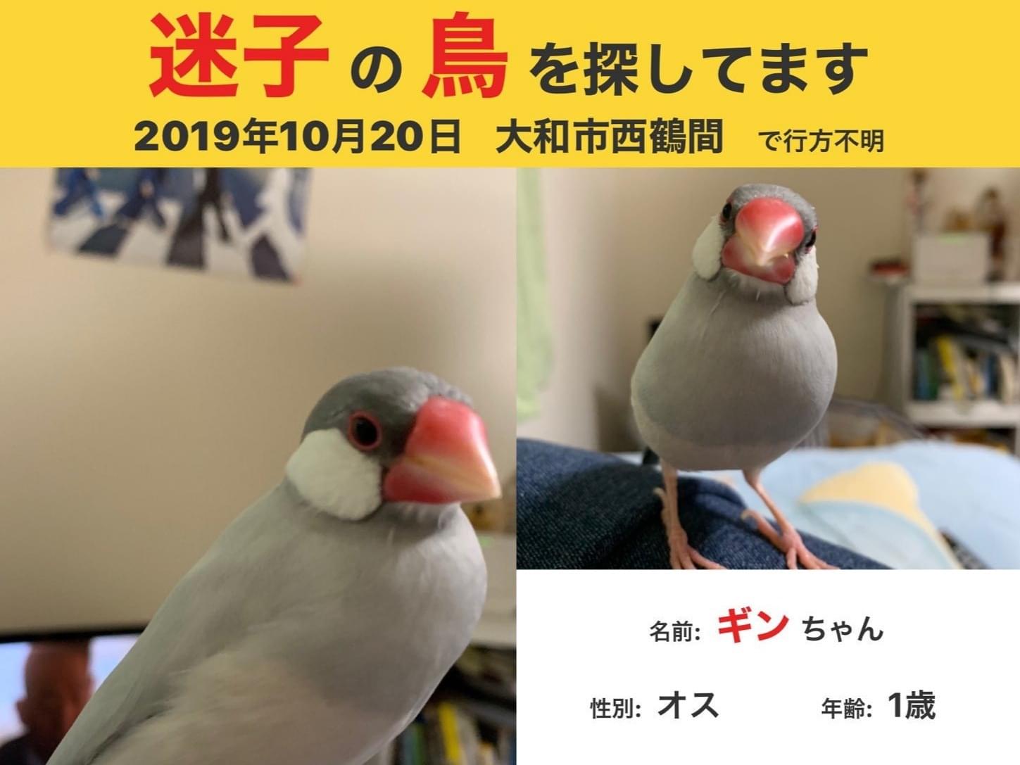 体長15cm程、シルバー文鳥(灰色)を探しています。10/20の18時半頃誤って自宅窓から逃がしてしまいました。人には慣れていますが、臆病です。