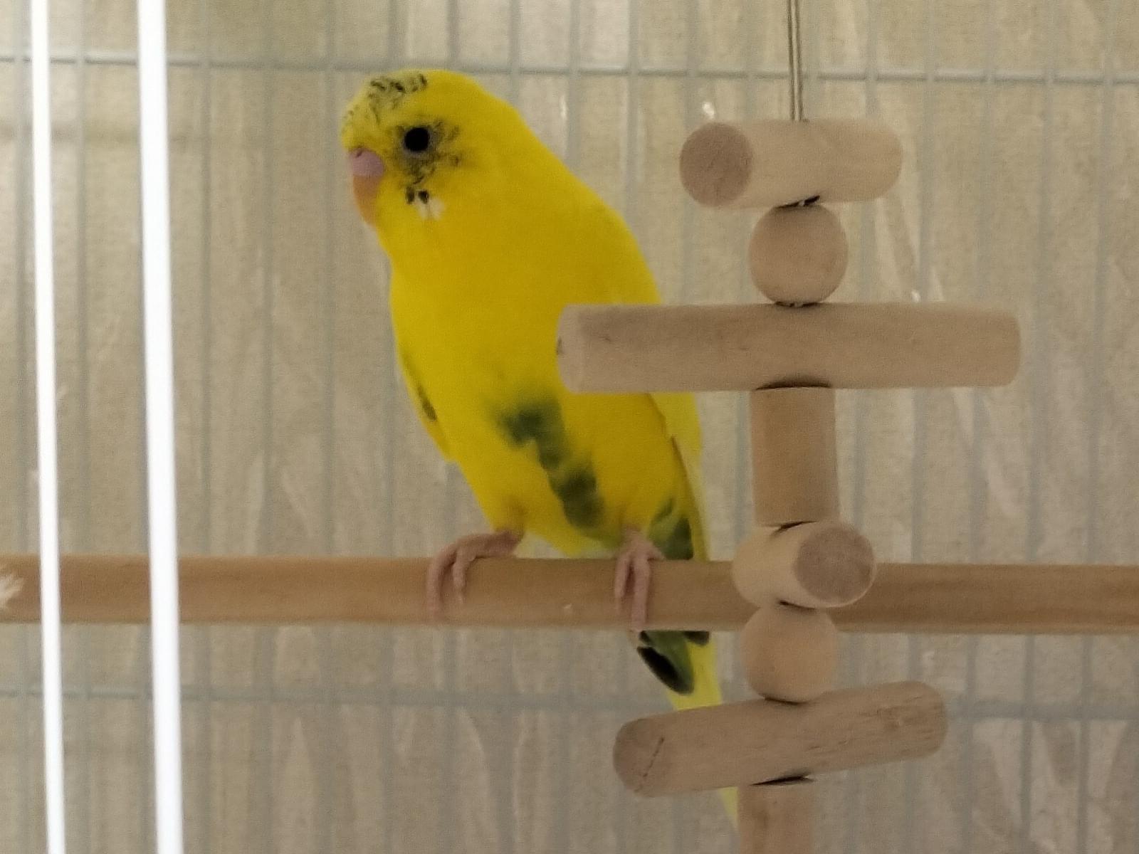 黄色くて目の下や翼の羽の先が黒いセキセイインコを探しています。