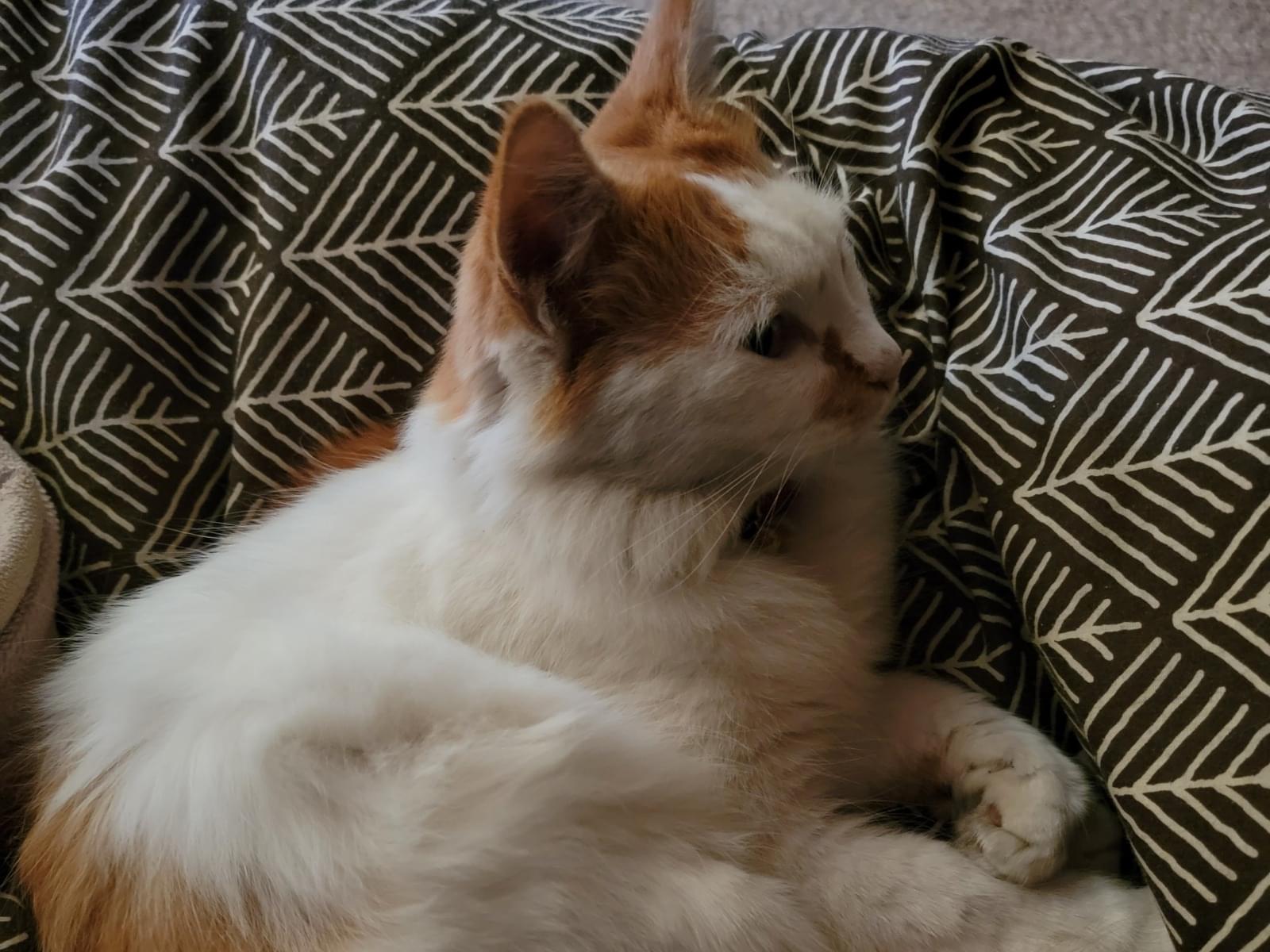 毛色は白と茶色の長毛で、背中に丸い茶色の模様があり、お尻の方も茶色です。目は黄色でしっぽは長く茶の縞模様で、赤のチェック柄のバンダナ風の首輪をつけています。何か情報がありましたら、どうぞよろしくお願いします。