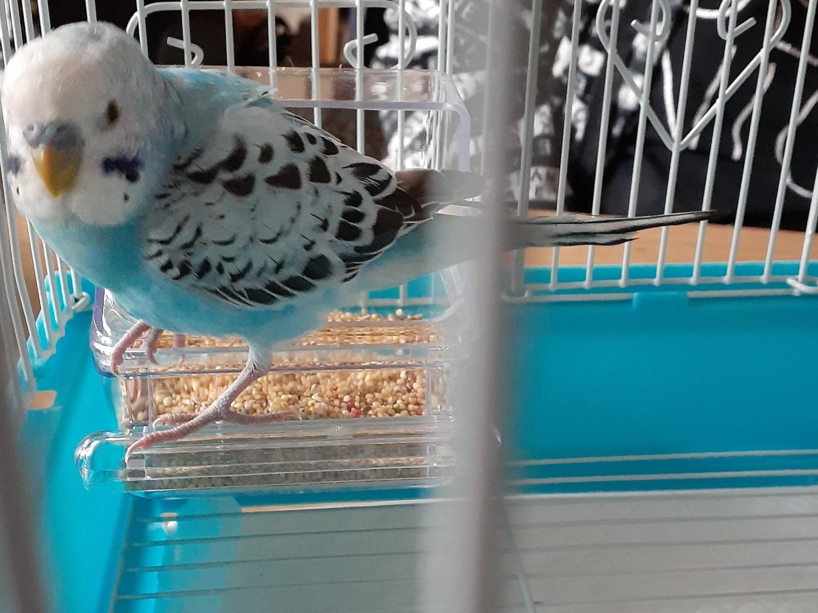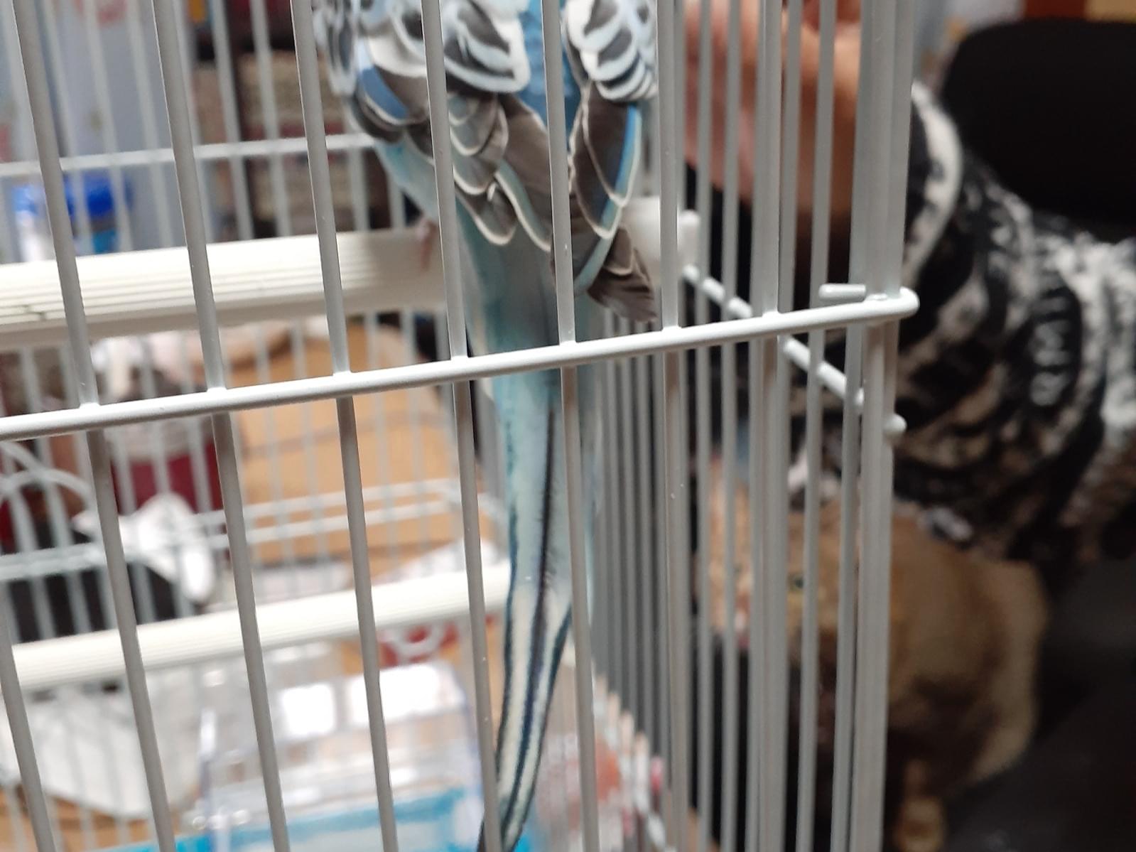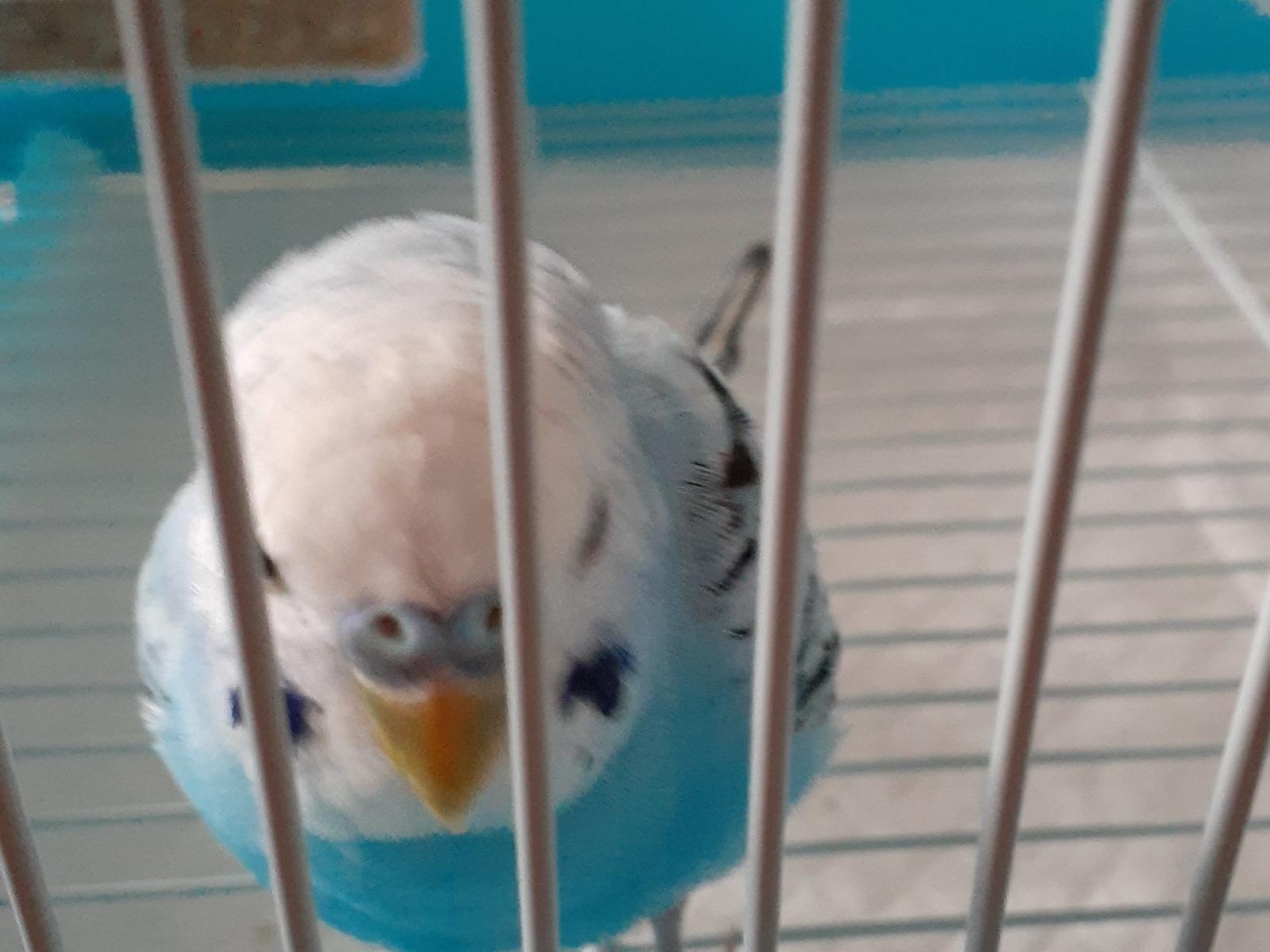 全体的 : 全体的に水色で羽の先が濃い青です。鼻は青紫です。性別はおそらくオスです。