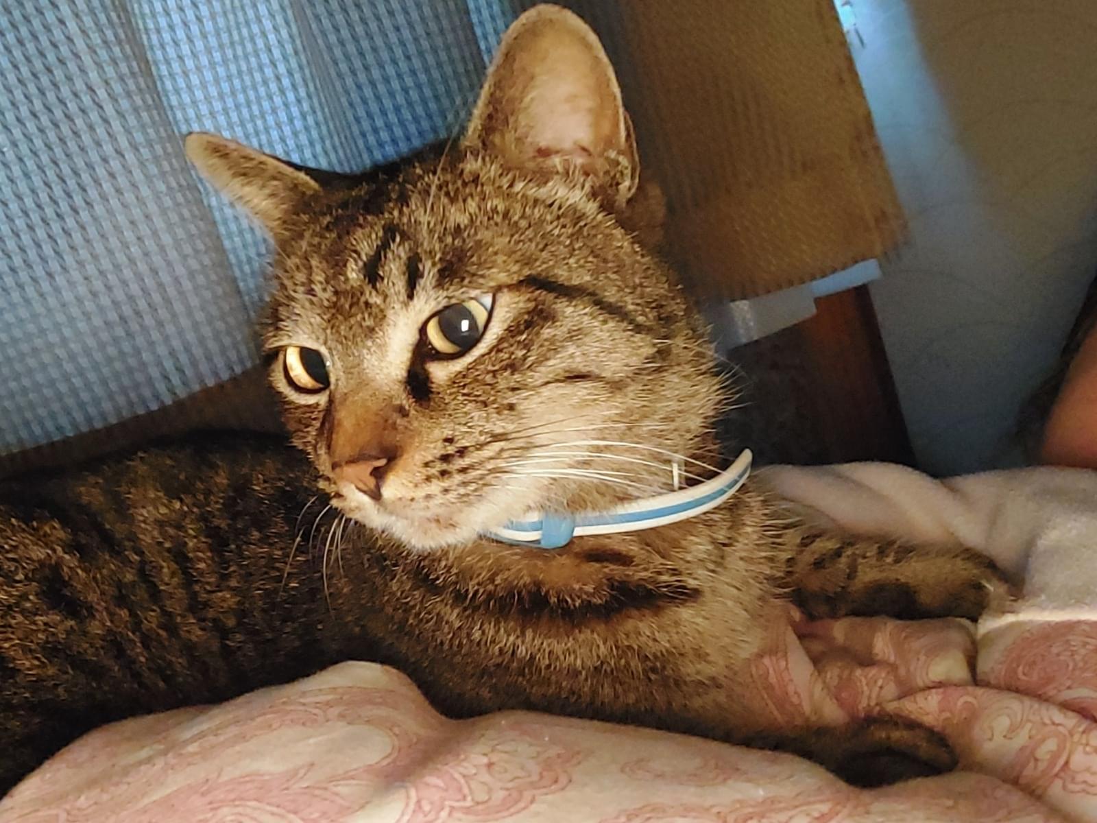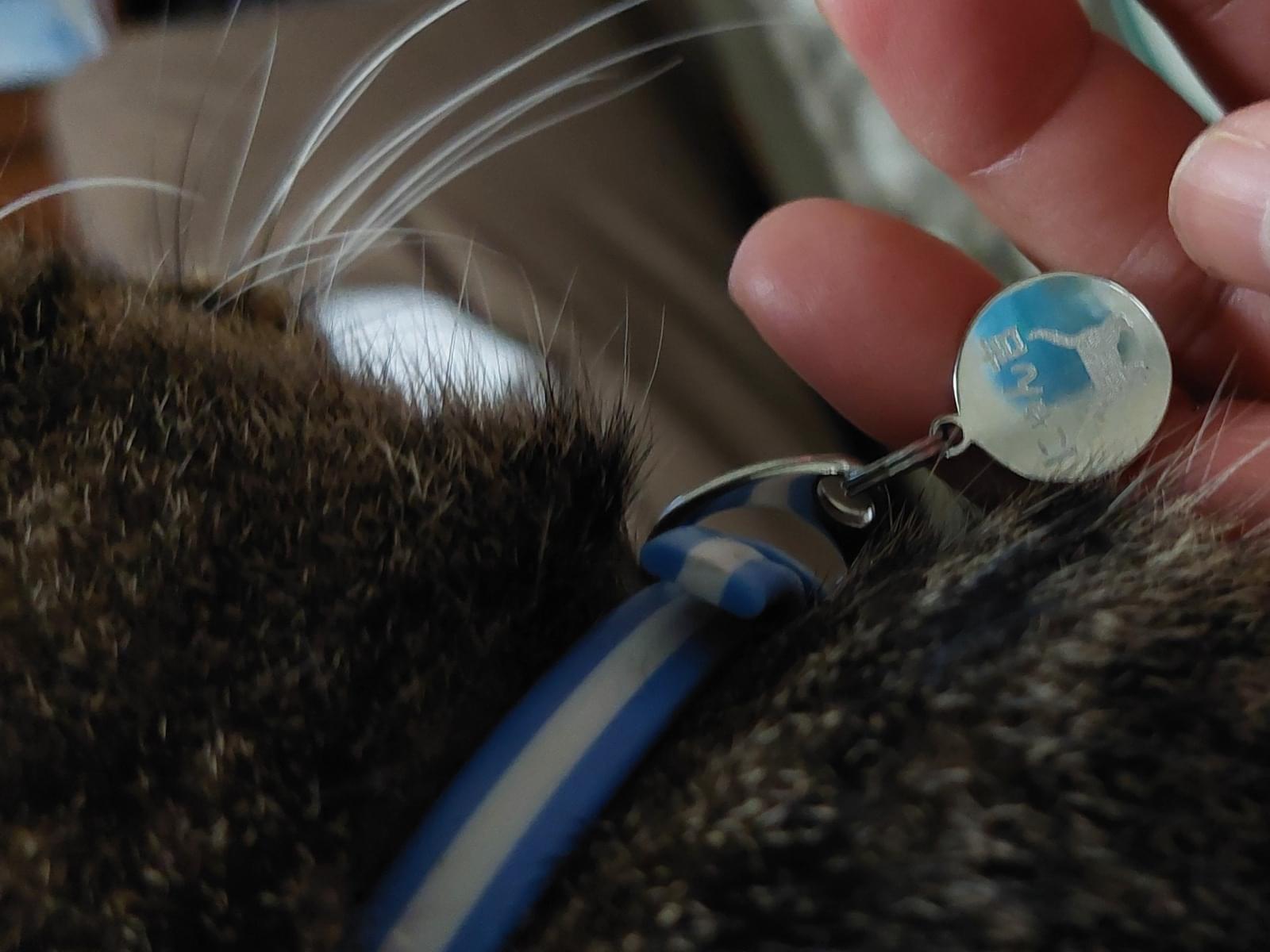 水色と白のストライプの首輪に、銀の迷子札。連絡先の電話番号刻印あり。