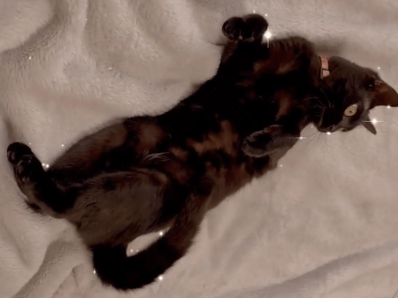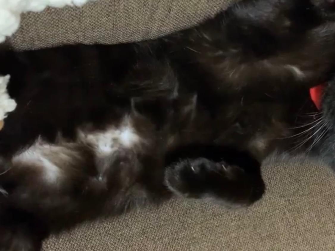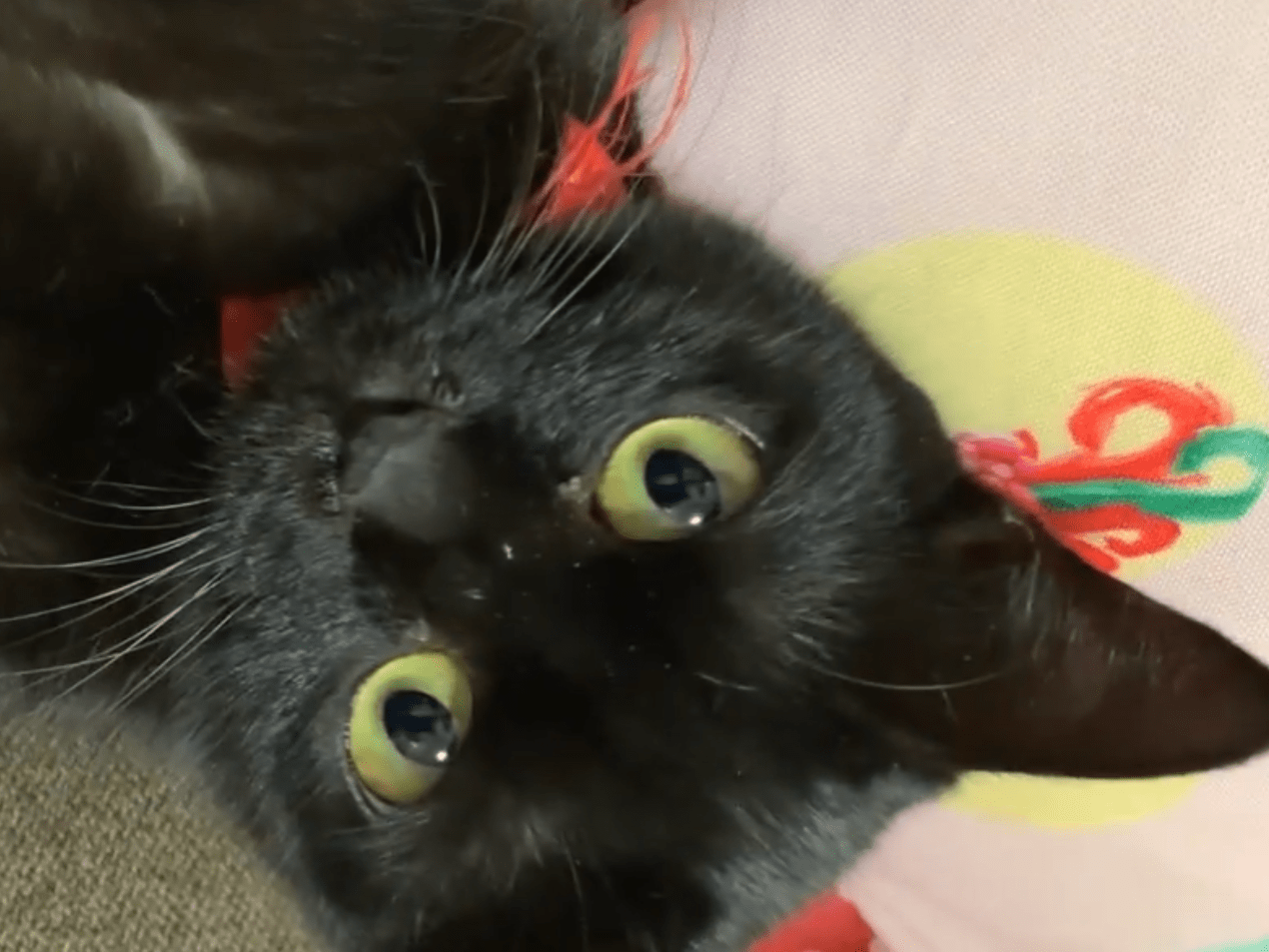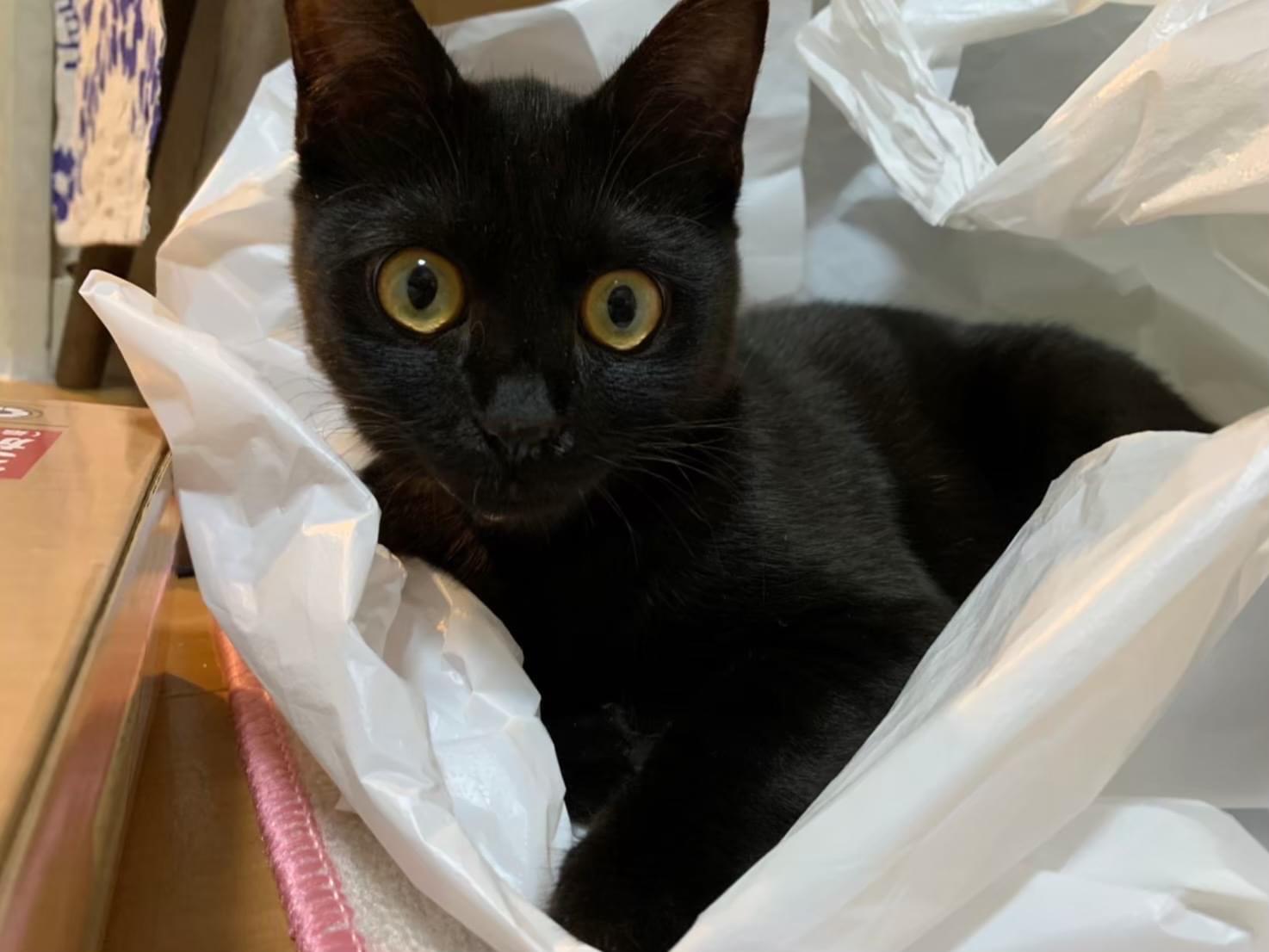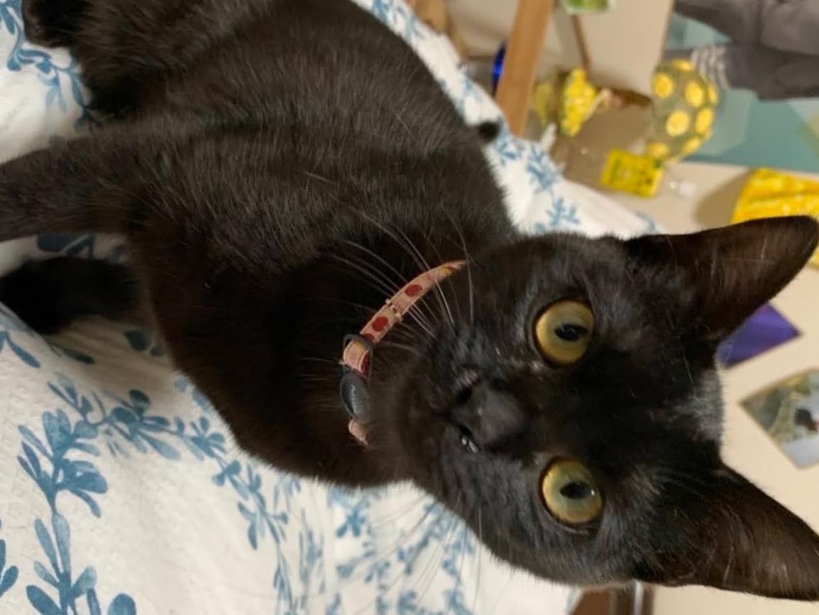 全身黒色で腹の一部が白いです。瞳の色が黄色いです。細身の体型でしっぽは長く首輪はつけていません。性格は普段は誰にでも懐き、よく鳴き、寂しがり屋の甘えん坊です。