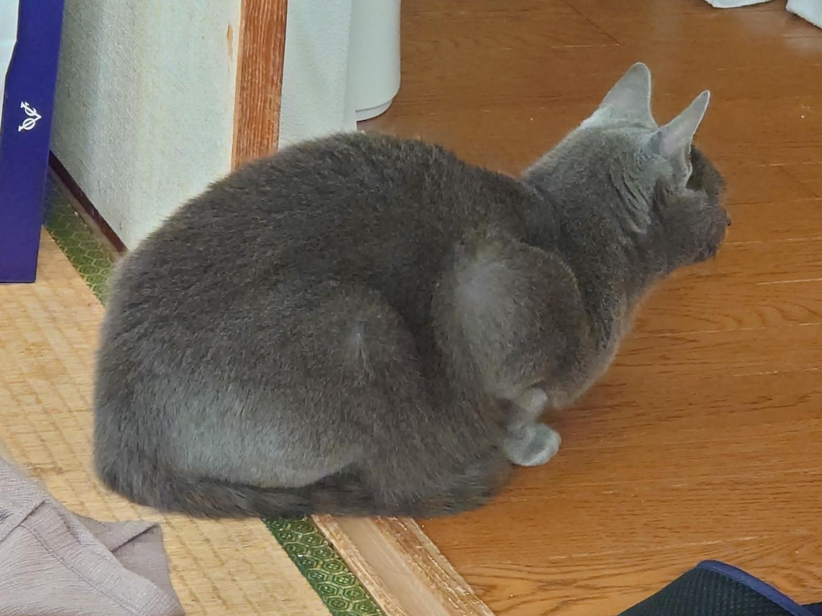 全身グレーで尻尾薄く縞模様があります。首輪は付けておらず若干太っています。