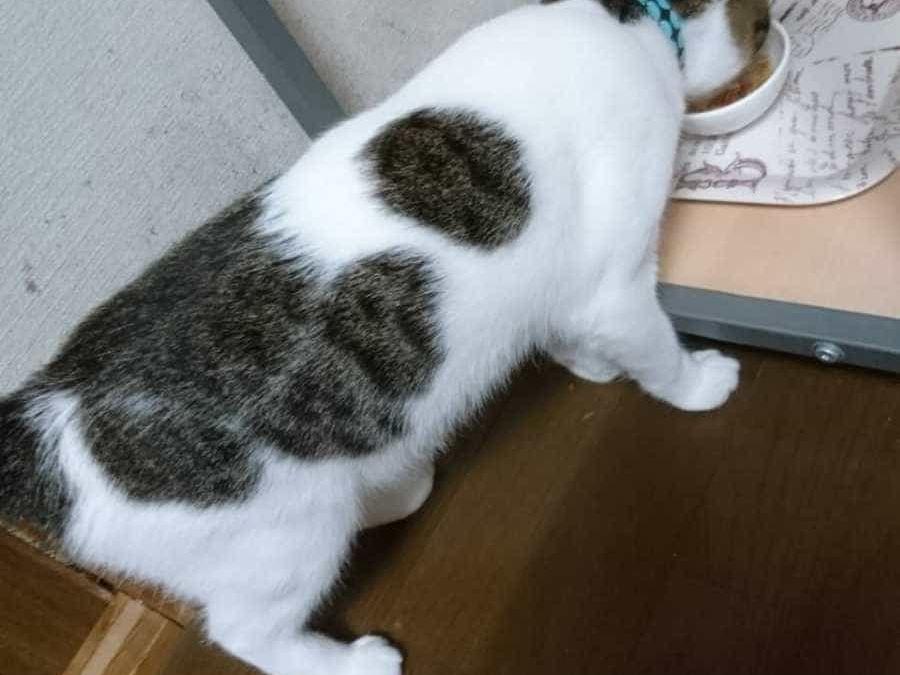 水色ドット模様で、鈴の付いた首輪をしています。