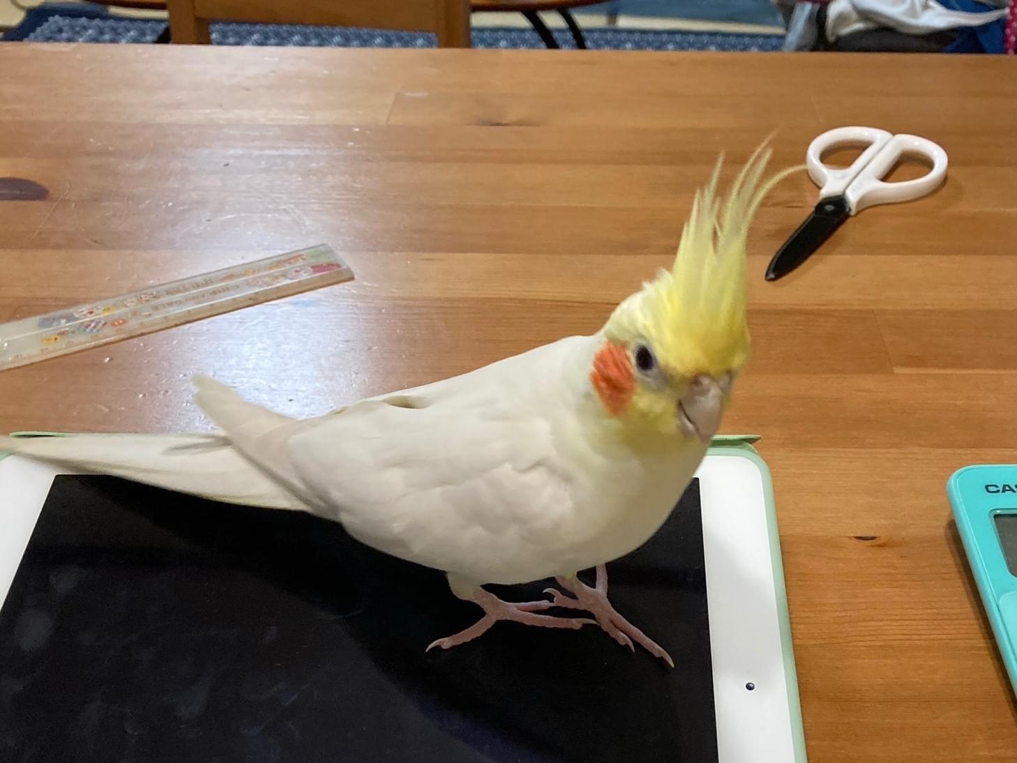 オカメインコ ルチノー白い色が多い背中に、少しだけうっすら薄いグレーがかっている。