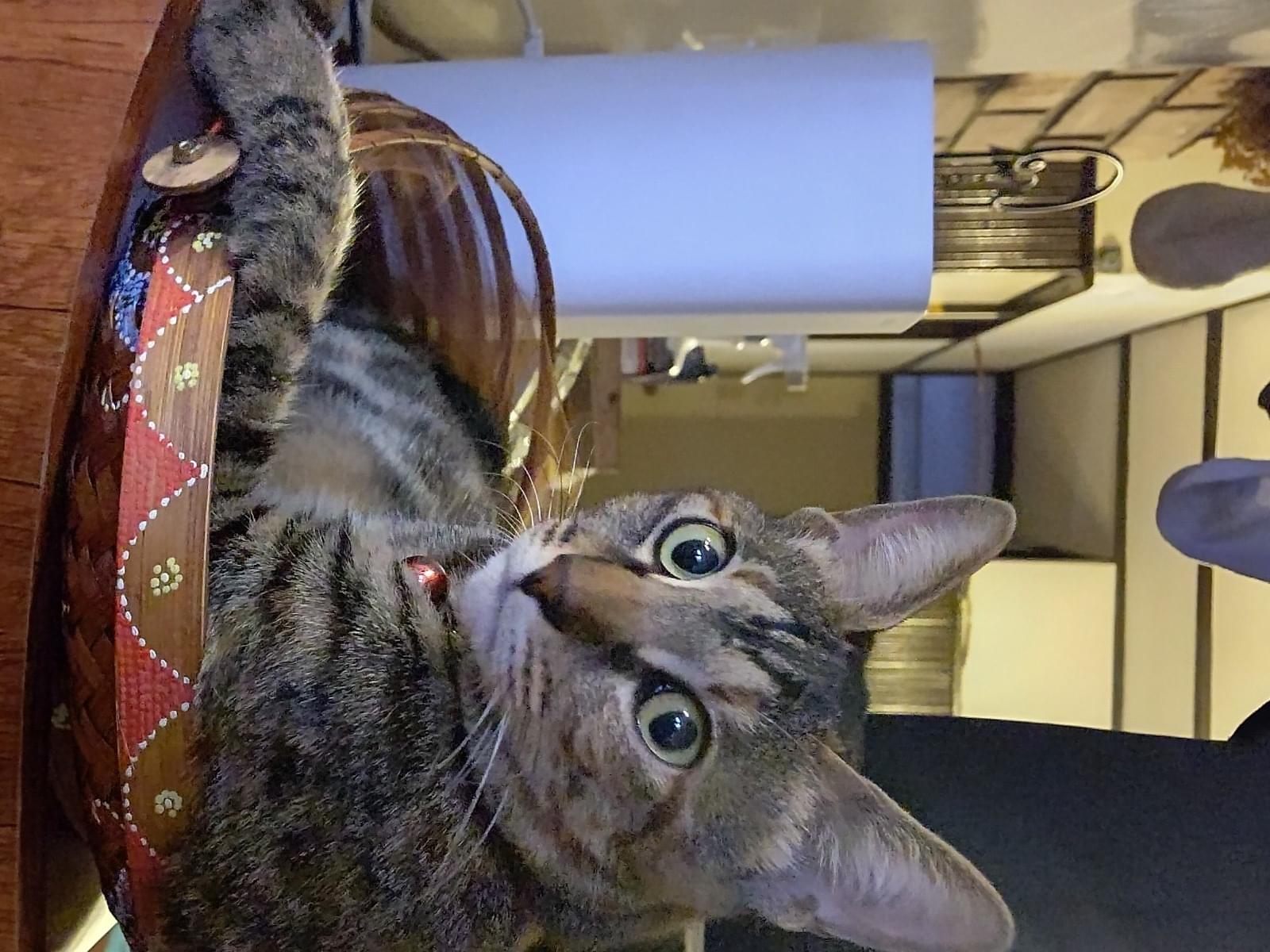 19日の夕方から家に帰っていません。キジトラの女の子避妊手術済で茶色が強めです。しっぽに特徴があり短く、ウサギのしっぽみたいにフサフサしています。性格は人なっつこいです。逃走時つかまえる際に首輪がとれてしまいしていません。