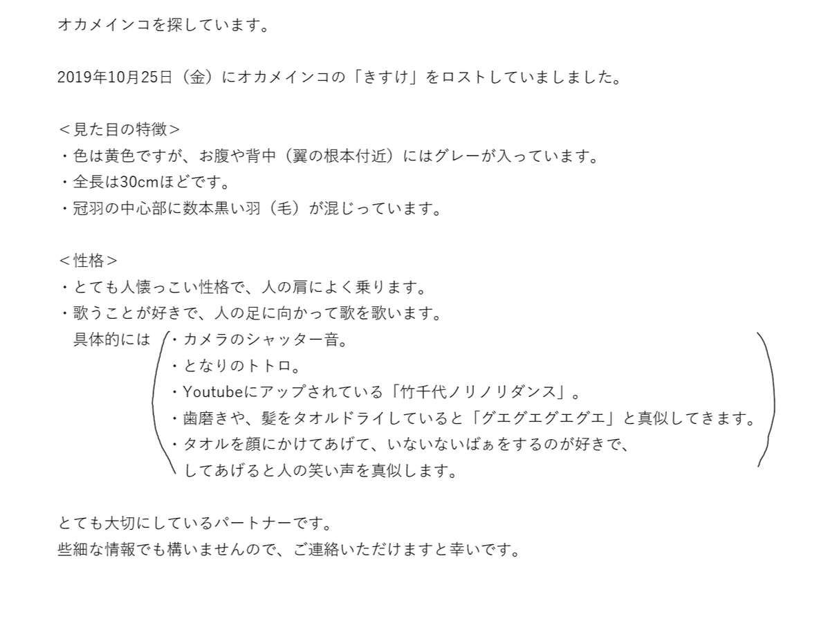 オカメインコが迷子になりました。