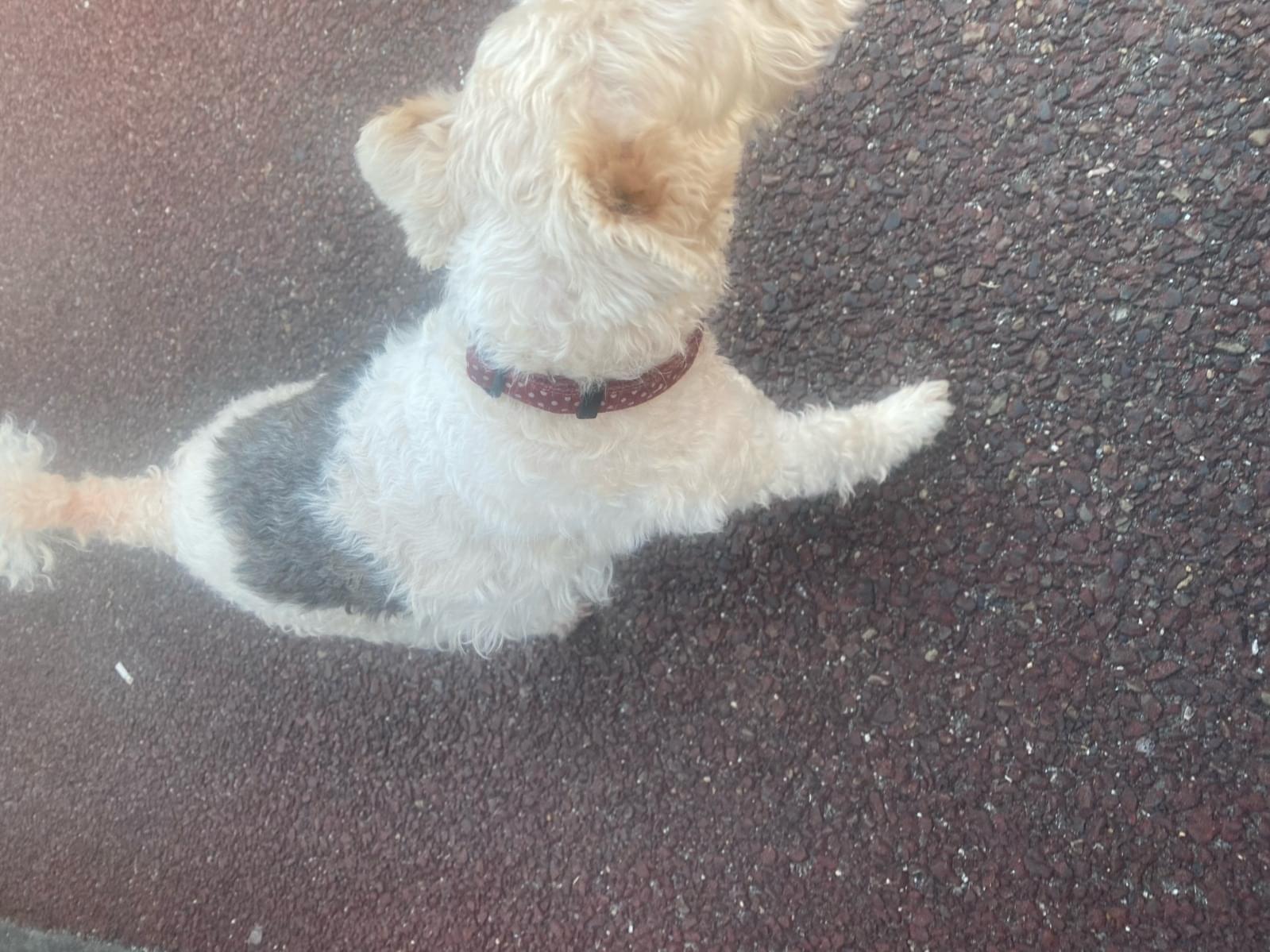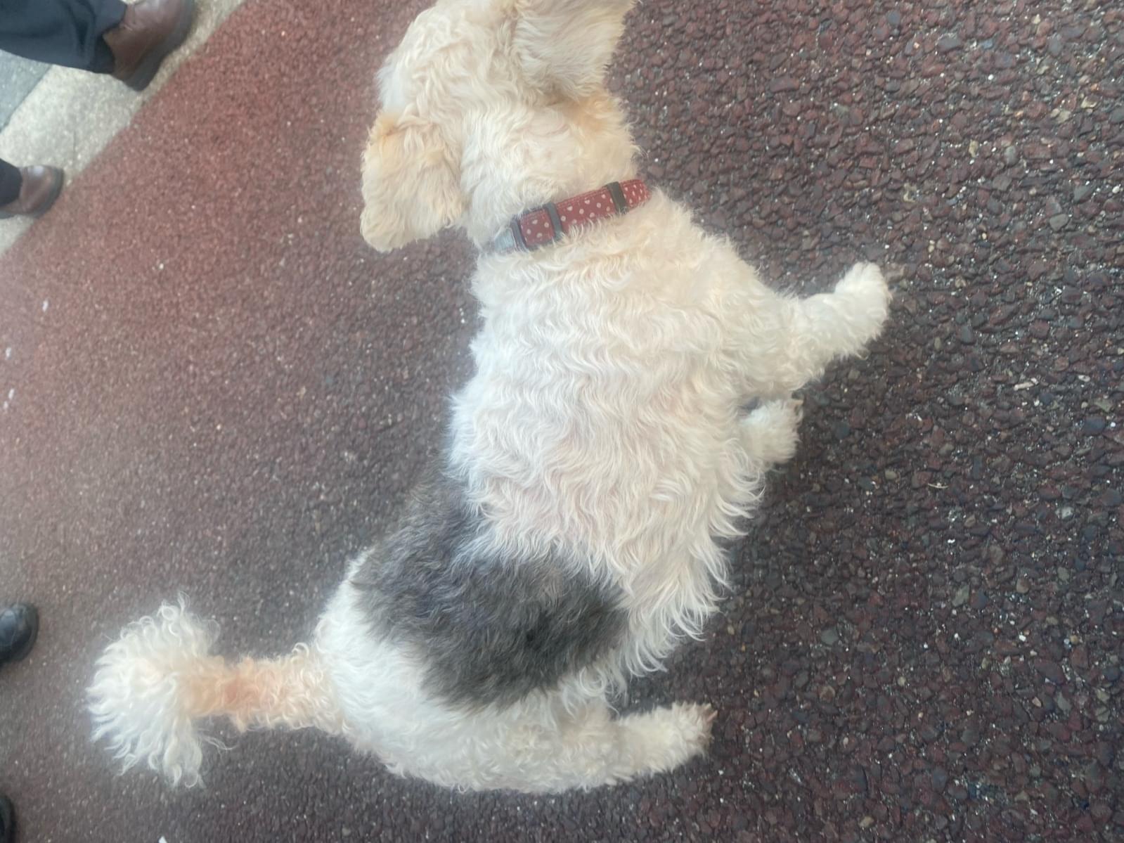 色はクリーム色で背中にグレーの丸模様、赤色の首輪をつけている、おそらくジャックラッセルテリアじゃないかなとおもいました。