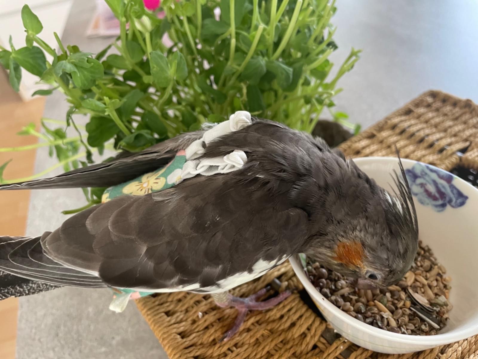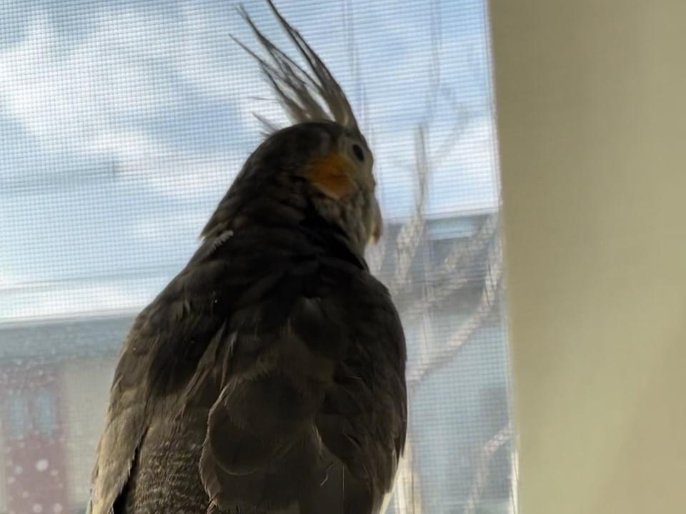 2023年3月4日(土)朝7:30に後追いをしてドアから飛んでいってしまいました。逃げた時は写真の中のオカメスーツは付けていません。5ヶ月の幼鳥でももちゃんと言うと返事をします。羽の生え変わりで長い尾っぽが2本抜けています。身体は光に透かすとグリーンぽく見えます。足は縞々模様で、首の後ろには2枚だけ白い羽模様があります。鳥の餌の他に、食パン、お米、蕎麦や麺類も好物です。宮崎北警察署に届出しております。保護して頂けた時は、お手数ですがご連絡をどうぞ宜しくお願い致します。宮崎北警察署TEL 0985270110