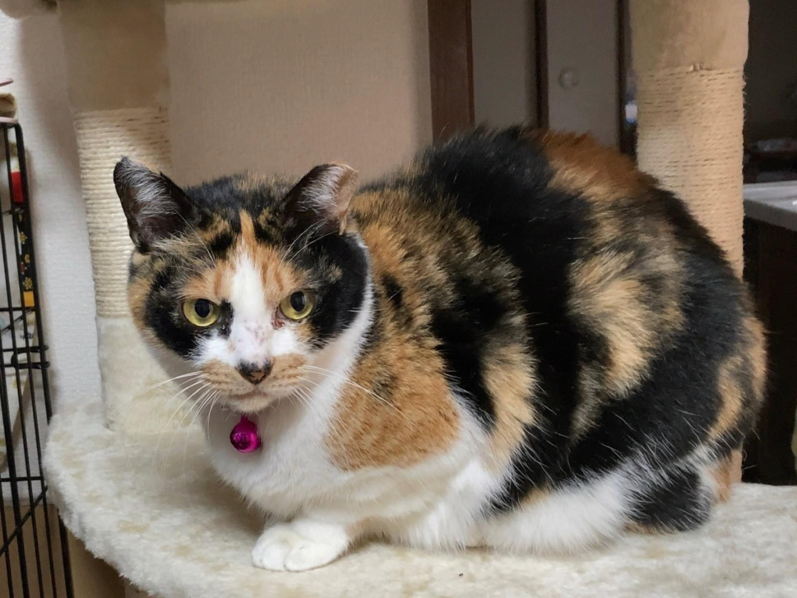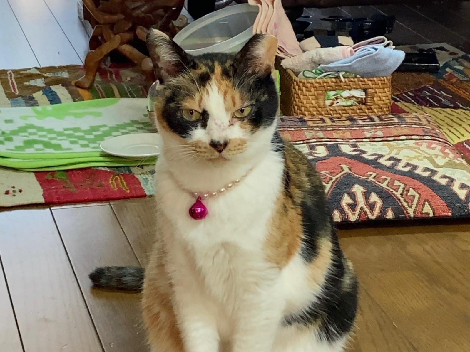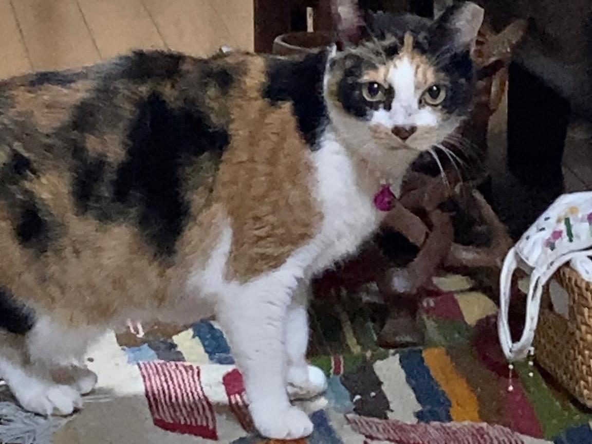想定8歳。4〜5kgぐらい。キレイな模様の三毛猫。ビーズの首輪でピンクの鈴を付けています。チリチリ鳴ります。保護猫で怖がりです。