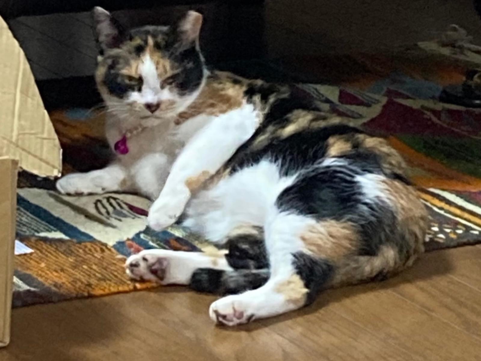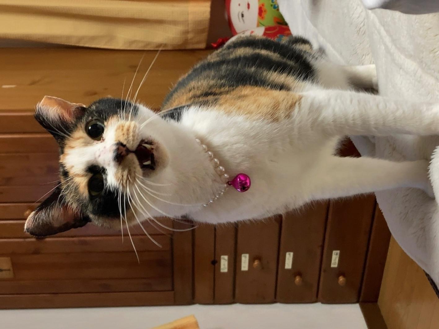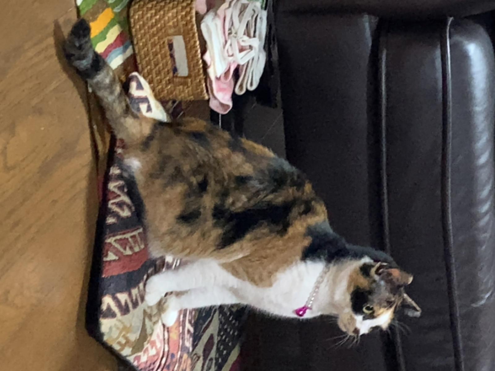 想定8歳。4〜5kgぐらい。キレイな模様の三毛猫。ビーズの首輪でピンクの鈴を付けています。チリチリ鳴ります。保護猫で怖がりです。