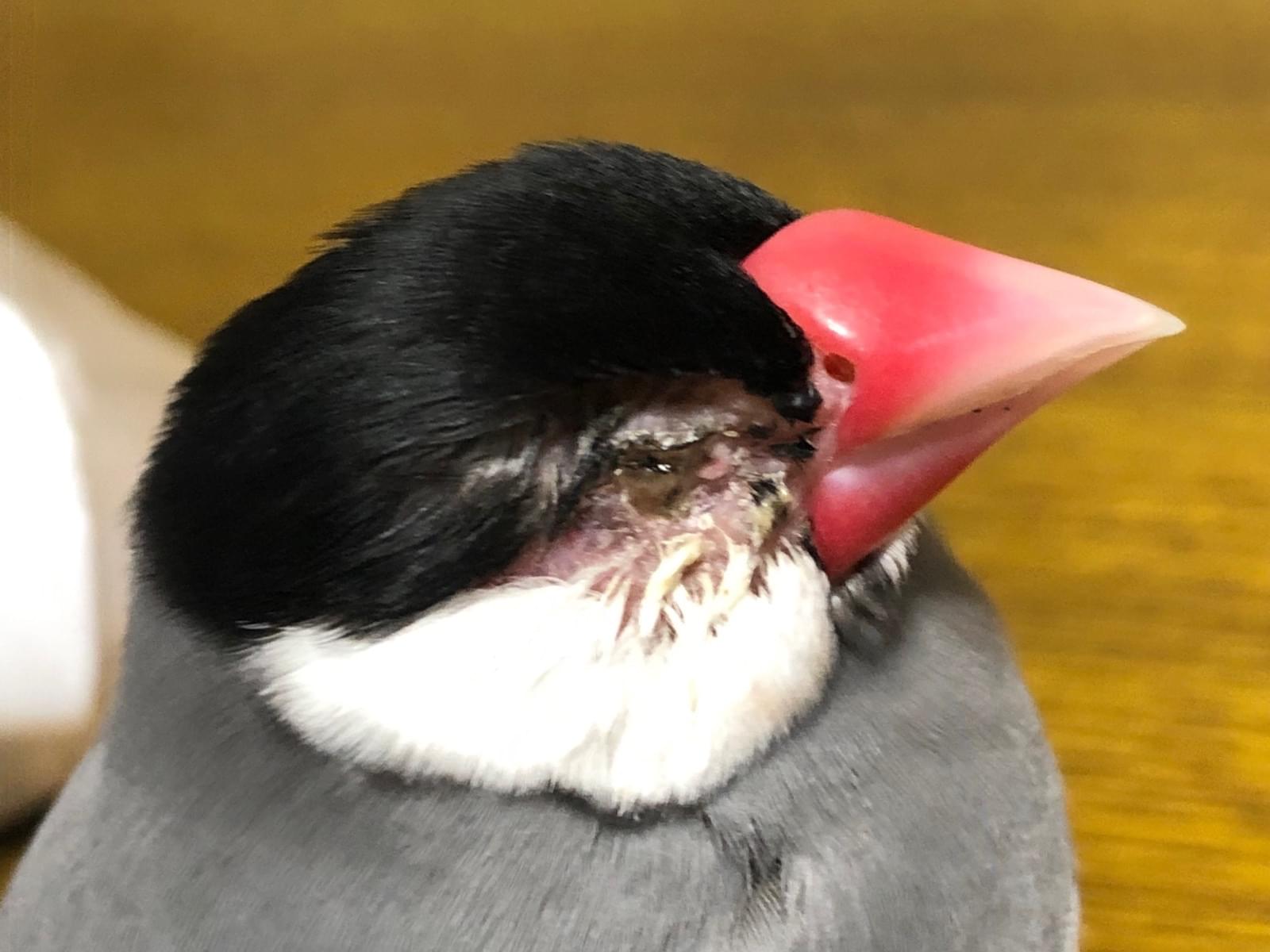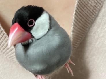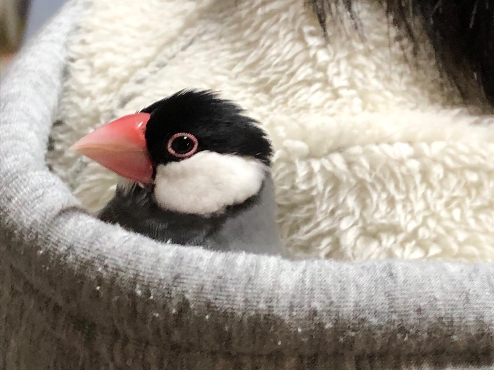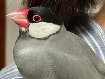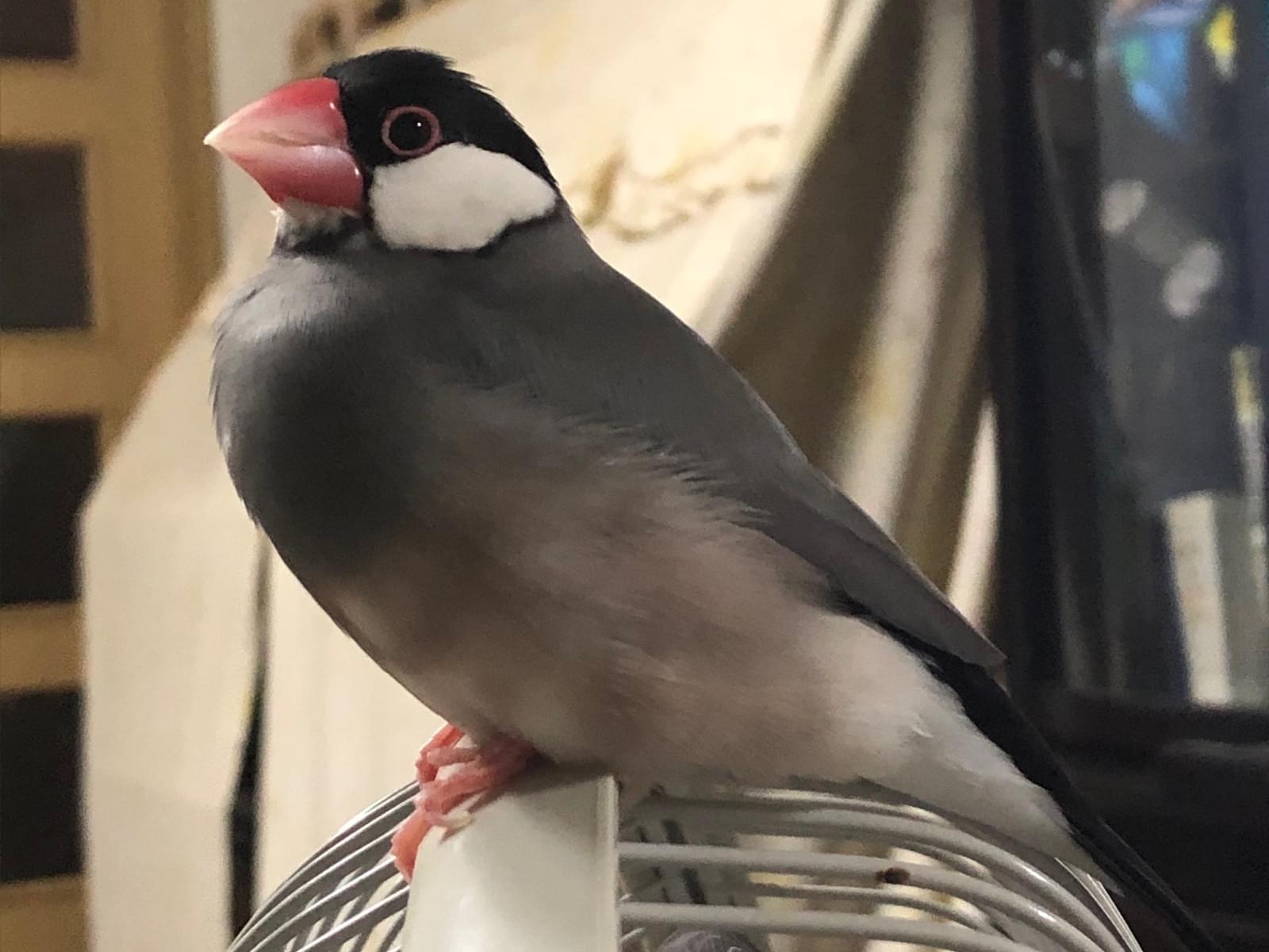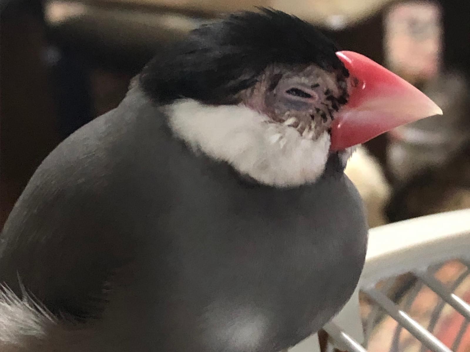 手乗り文鳥(桜文鳥)です。右目は失明している上、現在は毛で覆われてしまっており、完全に右目が隠れています。