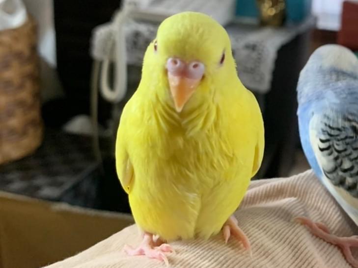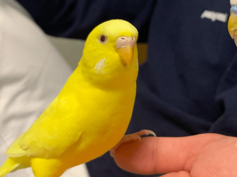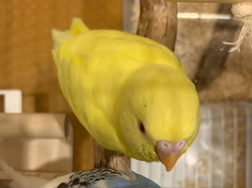 特徴は、全身黄色で目は赤色、小柄なインコちゃんです。あまり人慣れしていません。