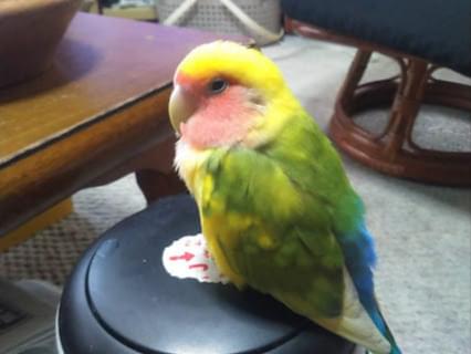顔がピンクで体が黄色、背中が緑のコザクラインコが迷子になりました。