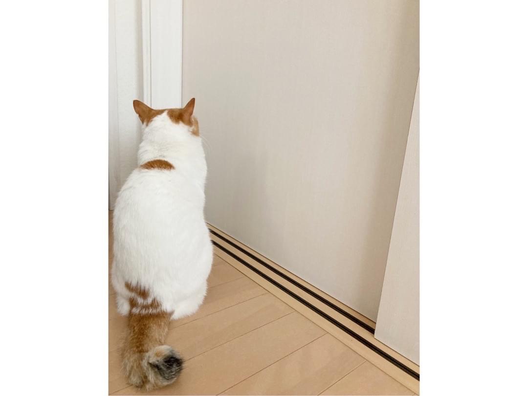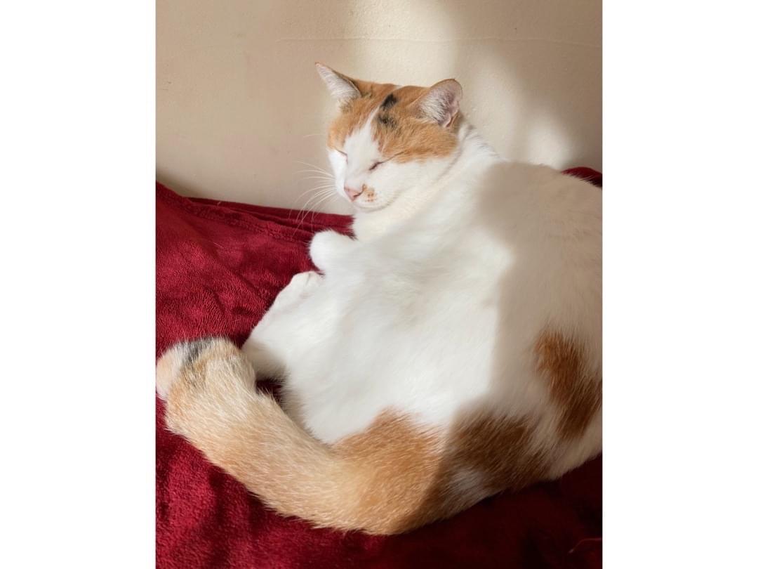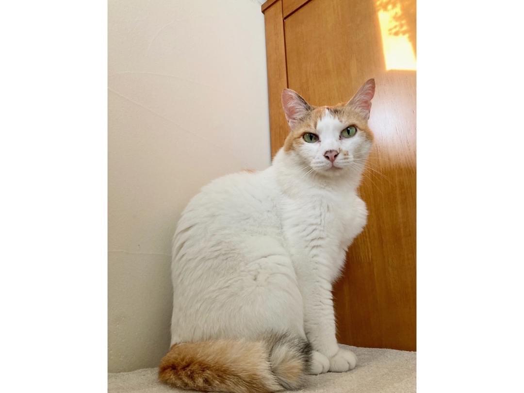 三毛猫、顔としっぽが茶色と黒、体は白色、背中に茶色い丸い模様が特徴