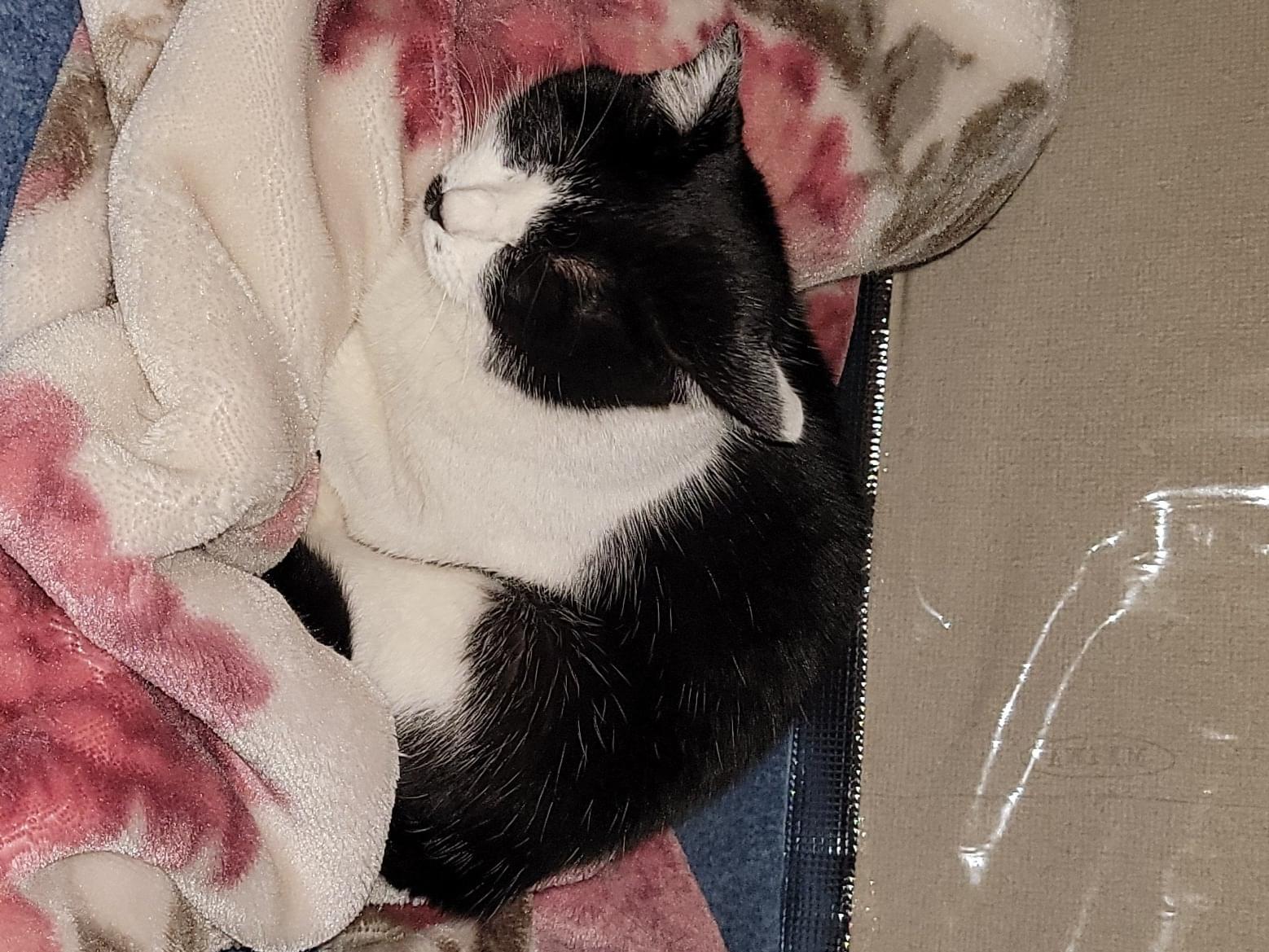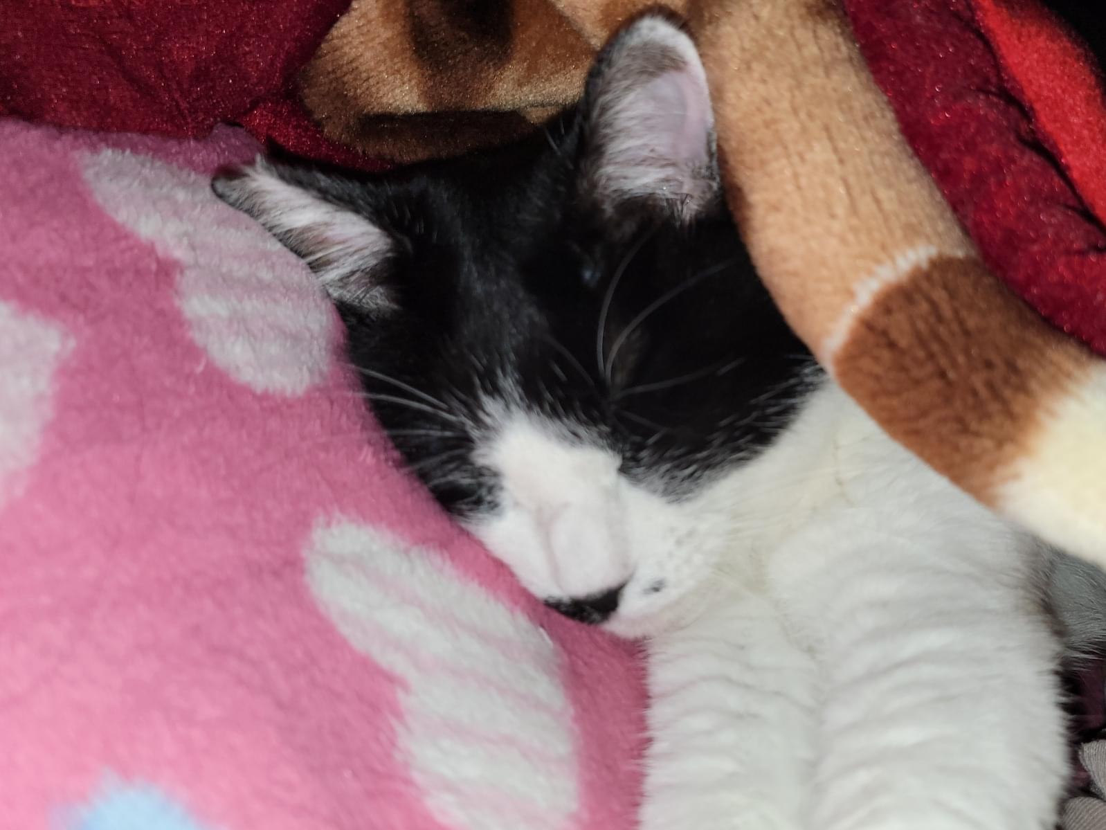 雑種の白黒の女の子です。鍵しっぽで、手足は白く、鼻の左側に小さいほくろ模様があります