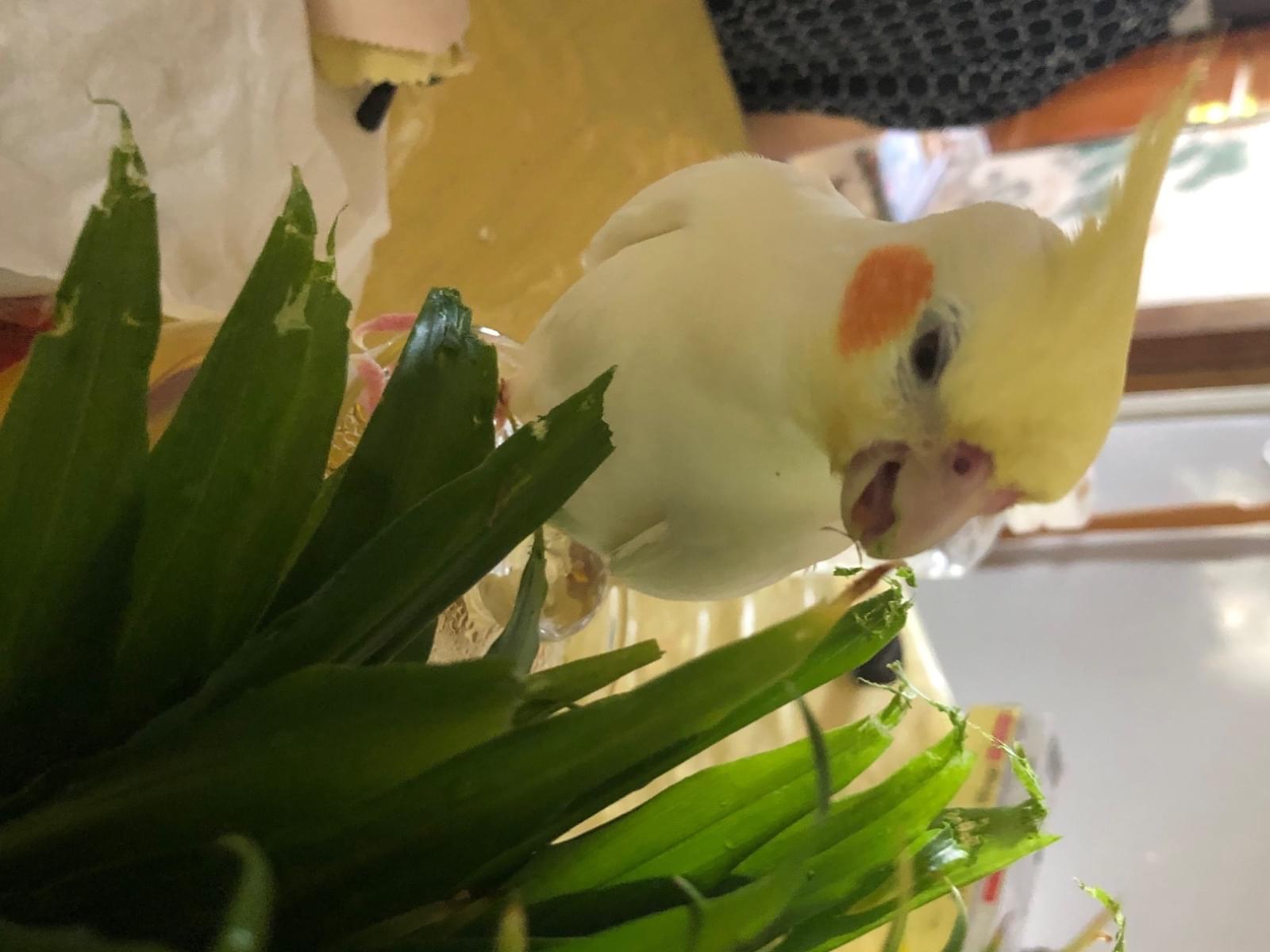 体の色は白色のオカメインコで、時々「おーちゃん!」と鳴きます。