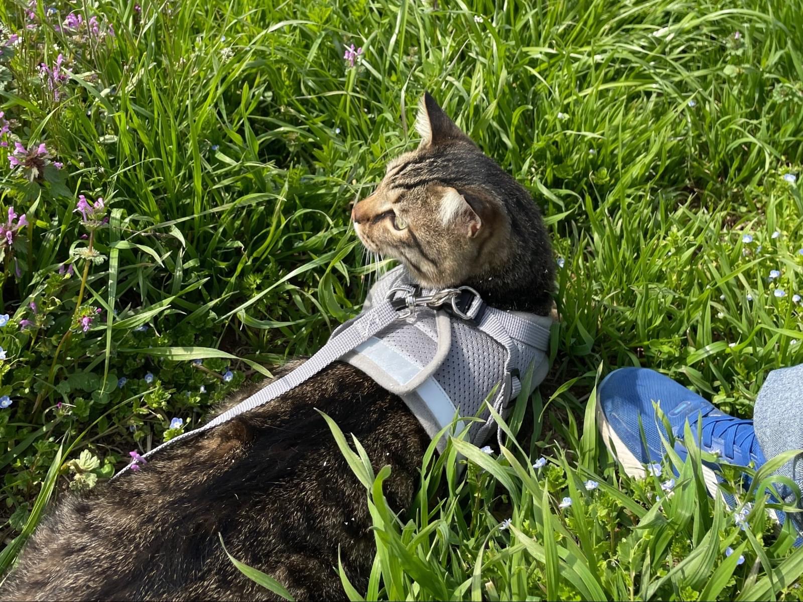 キジトラのオスを探しています。口の周りが白く、尻尾は長くてまっすぐです。左耳の先が切れています。連れて行っていた所で車の音に驚いて、付けていたハーネスを外して逃げてしまいました。首輪も嫌がるのでしていません。