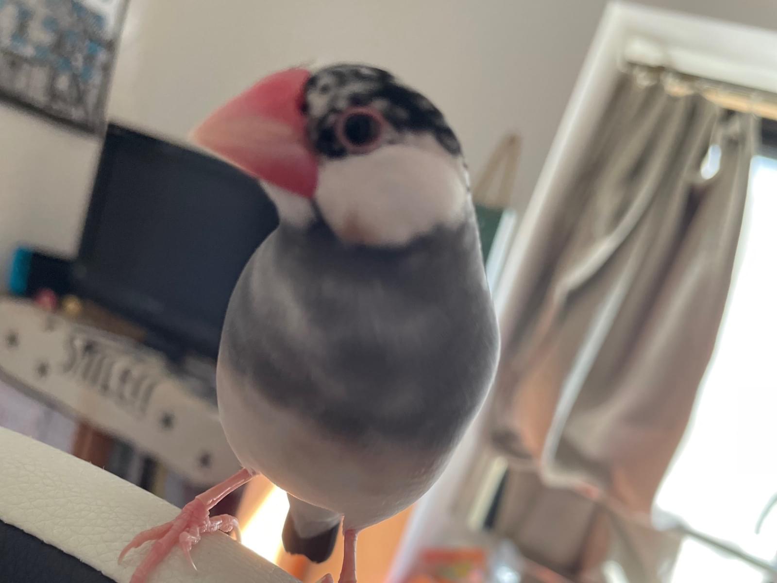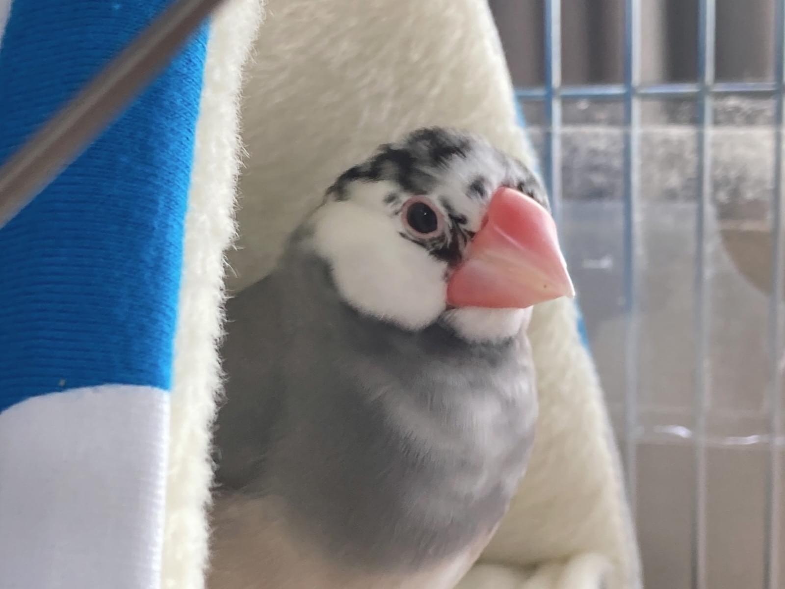 毛並みは灰色で頭は白黒クチバシはピンクの文鳥を探しています。