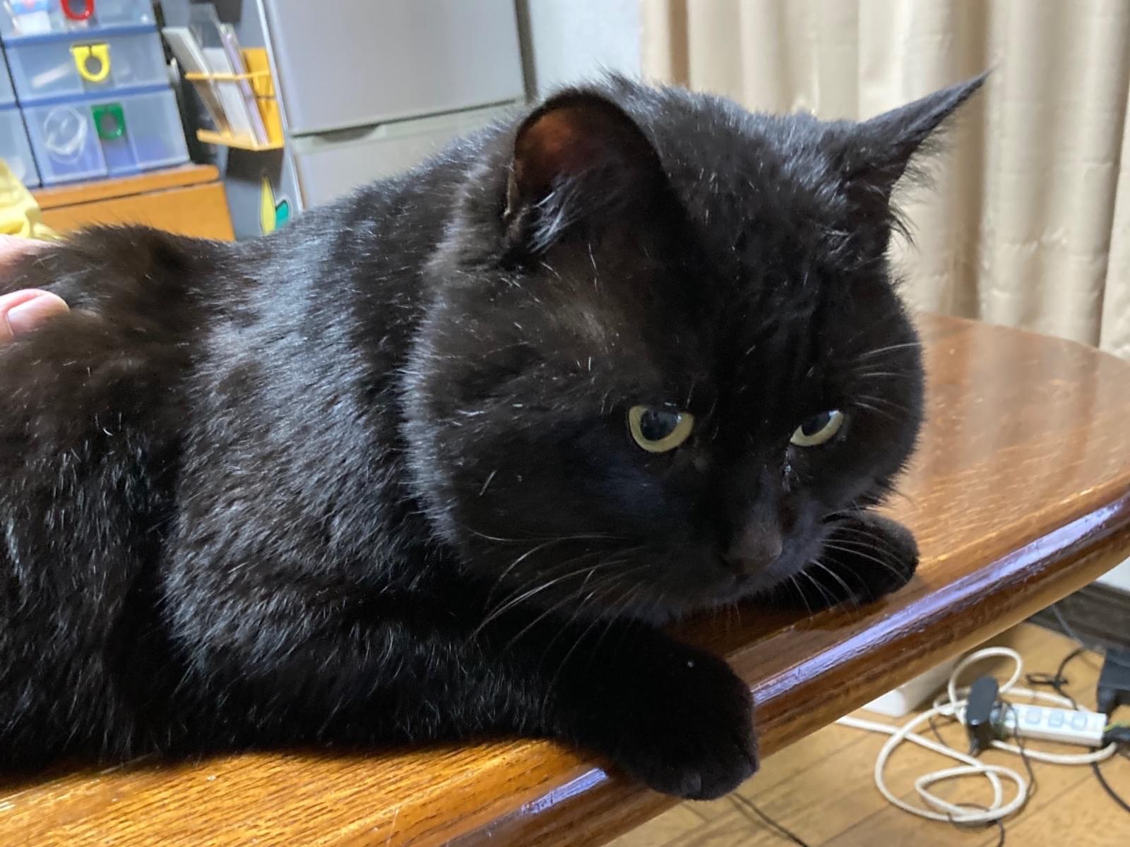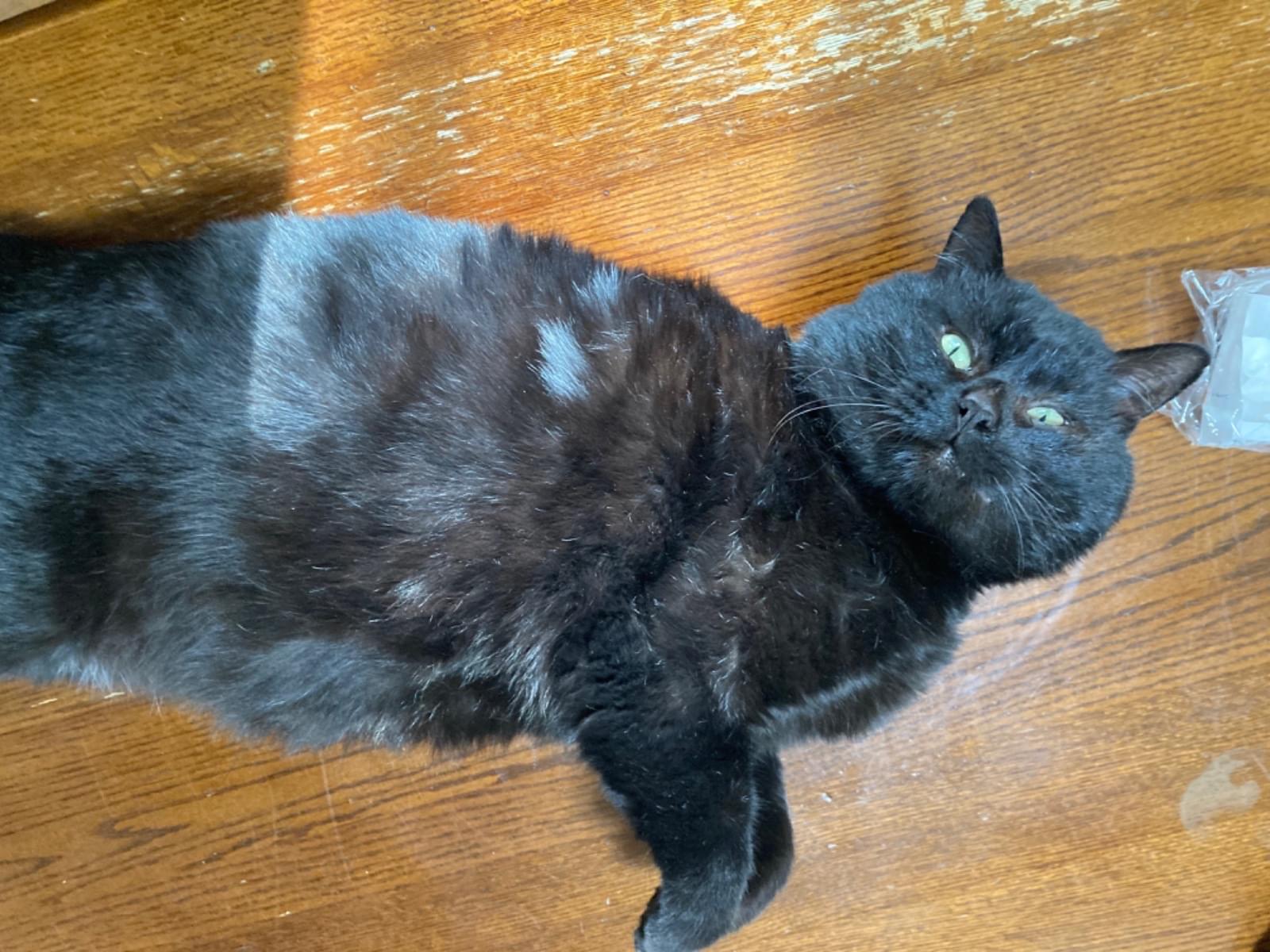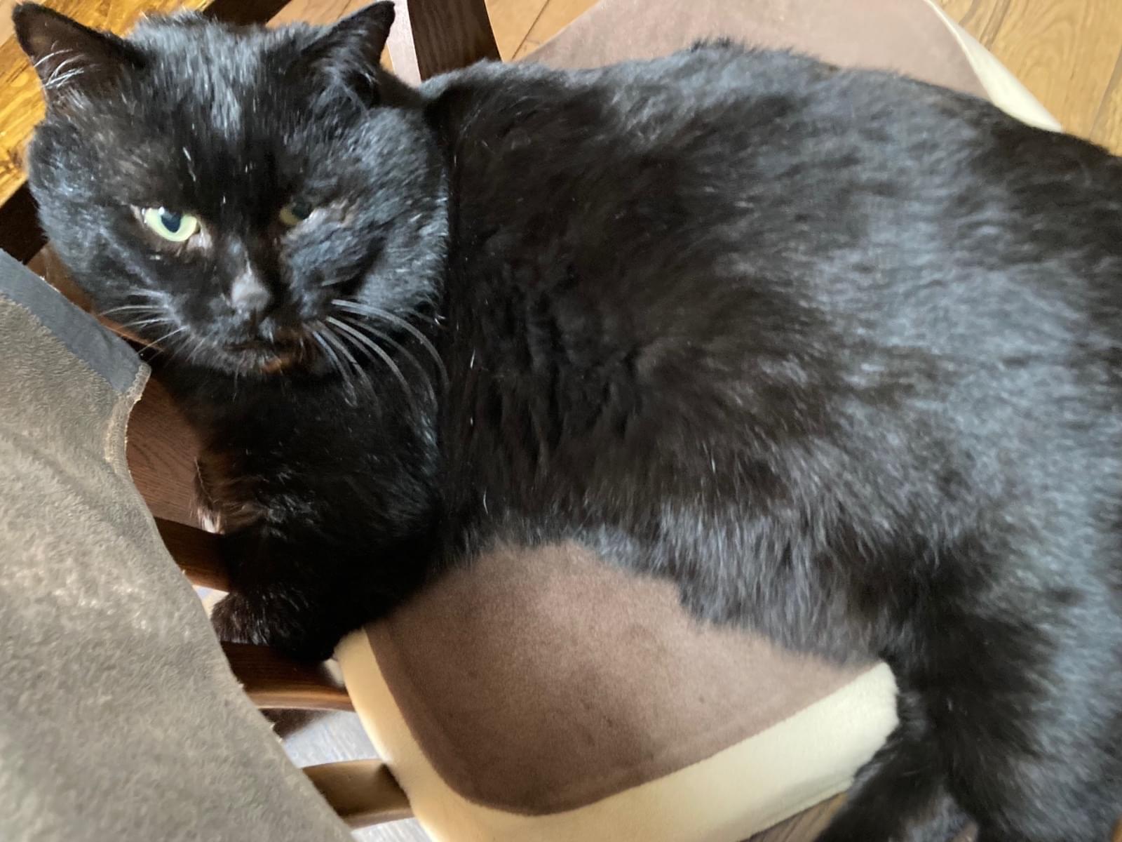 真っ黒ですが、近くで見ると背中に白い毛が所々にあります。右耳の後ろの毛が薄いです。