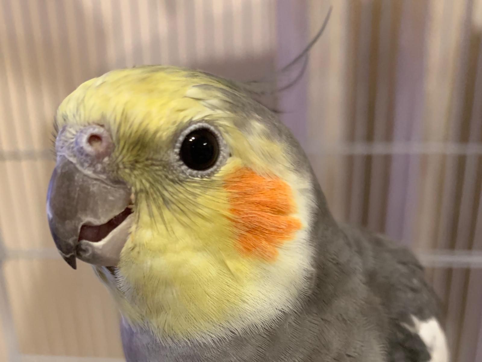 体はグレーで、顔が黄色、ほっぺはオレンジ色です。