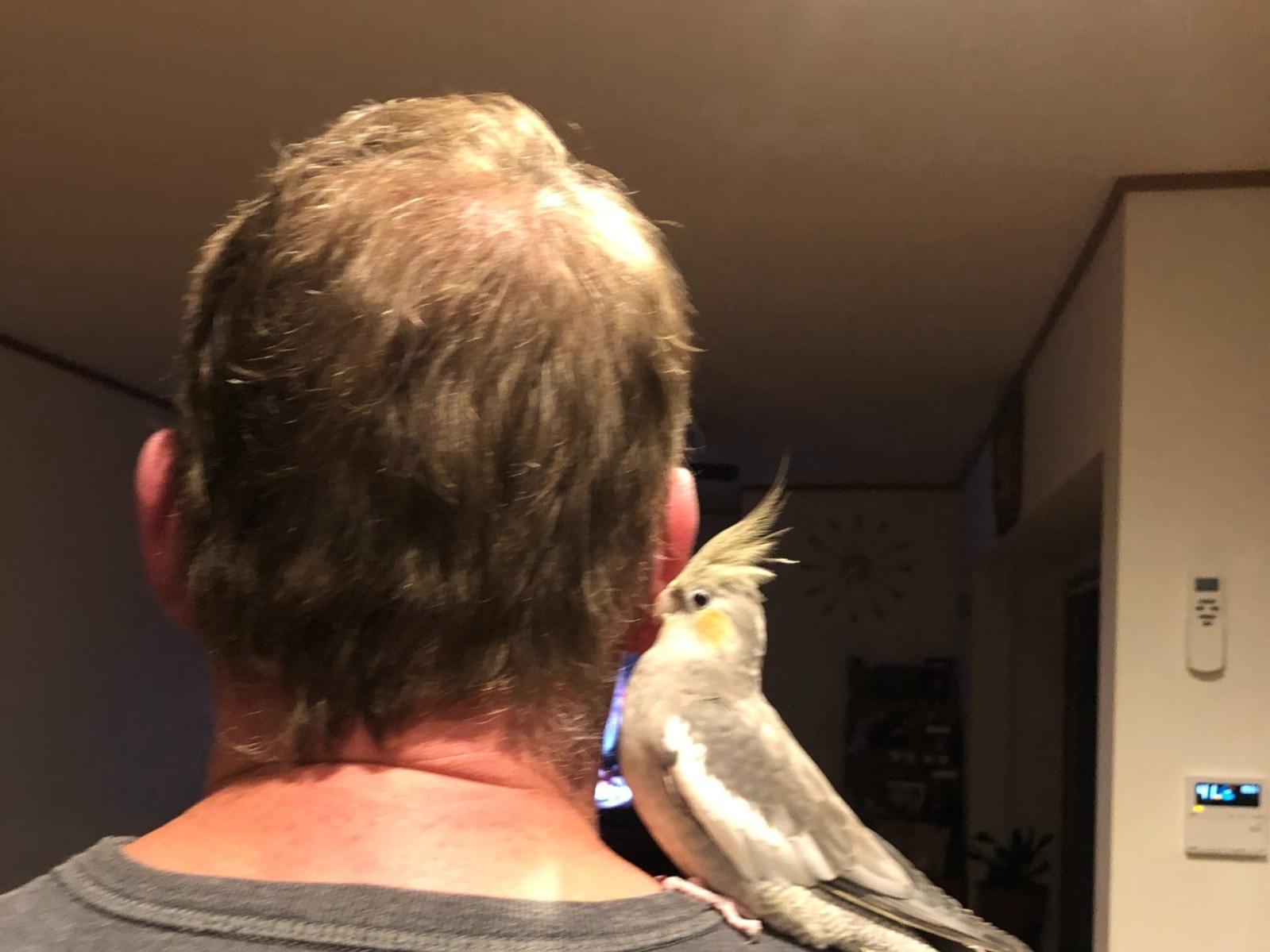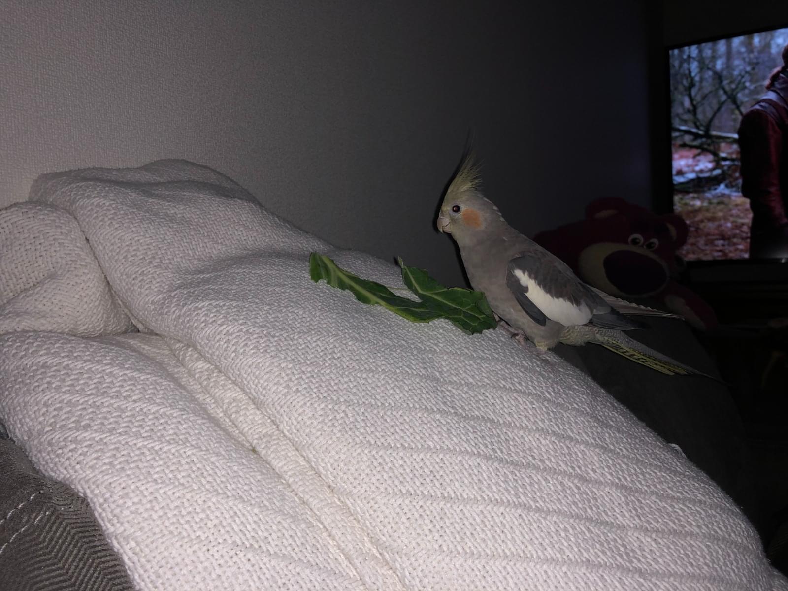 オカメインコ ノーマル グレーの羽、オレンジ色のほっぺたでよく啼く女の子です。