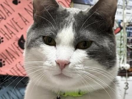 黄緑の魚の骨柄に鈴付きの首輪してます。