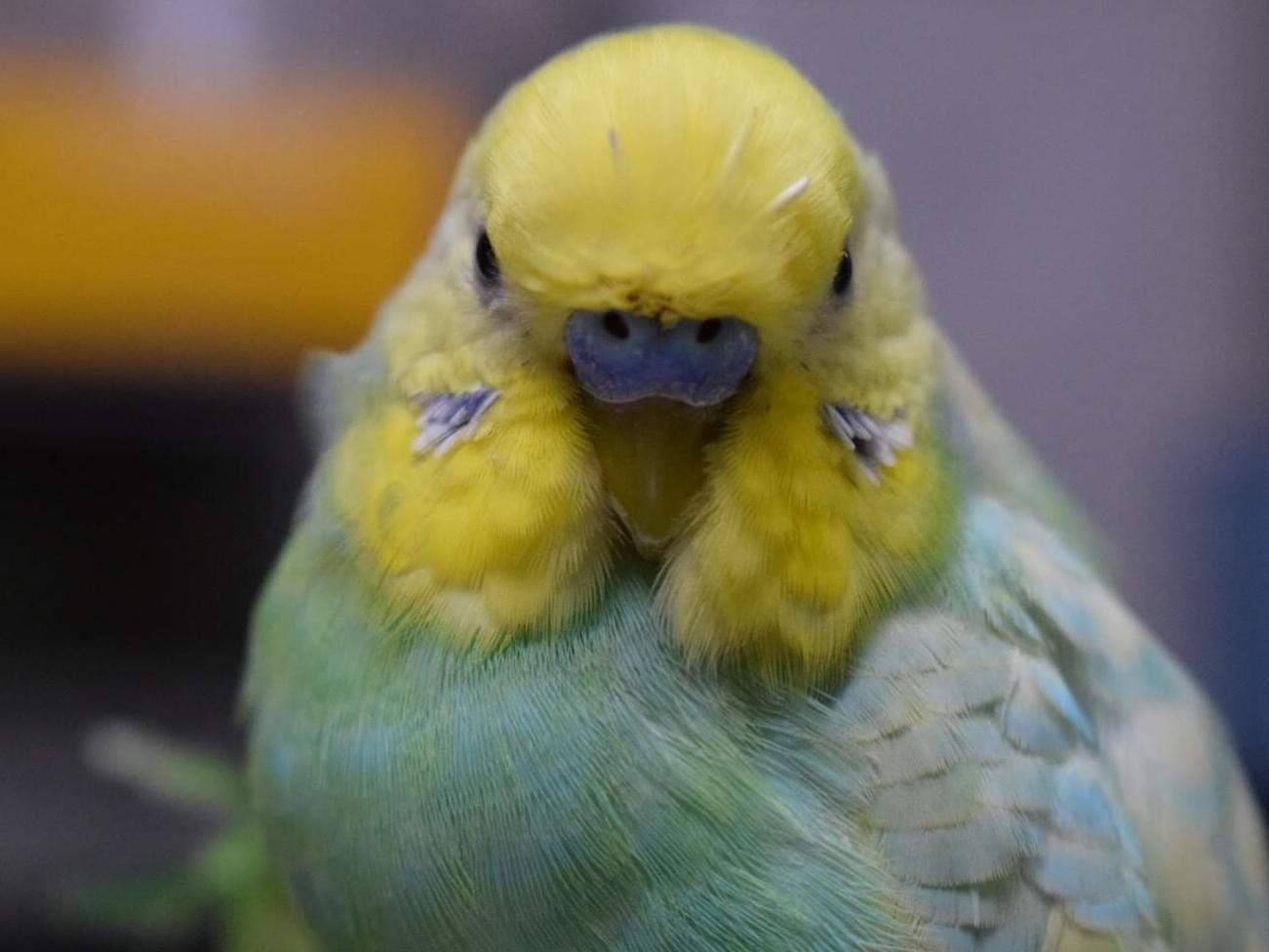 茨城県水戸市にて体は水色、頭は黄色のインコちゃん