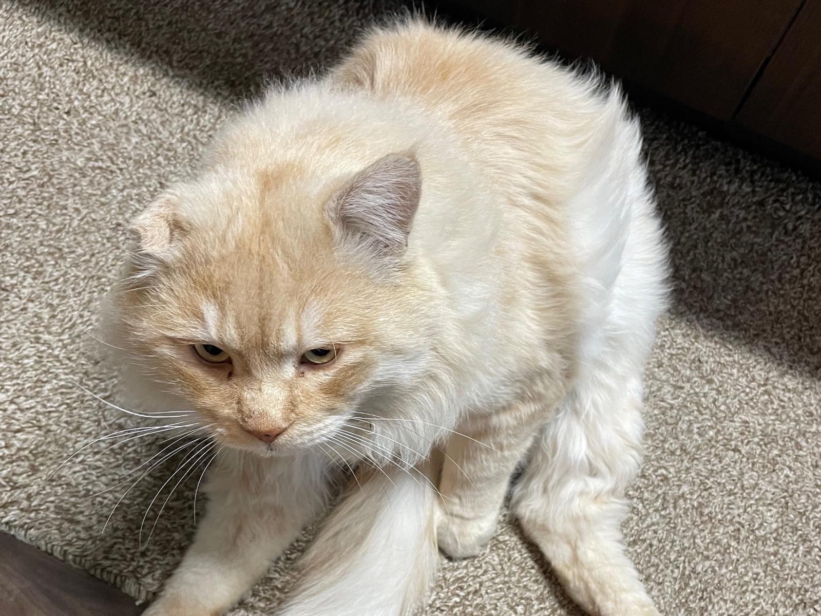 右耳が萎縮してます。クリーム色で長毛の雑種猫です。