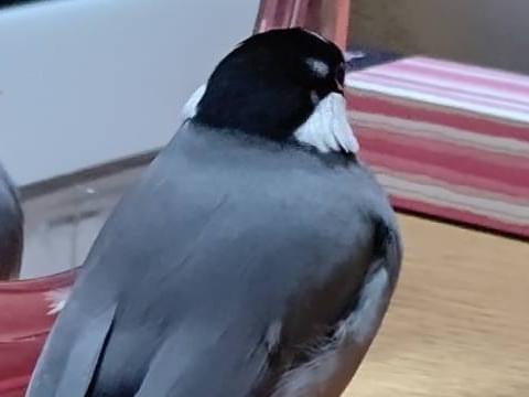 お腹と背中はグレーですが、お腹側は少し薄め、しっぽは黒、頭は黒と白の斑点模様、目の周りとくちばしはピンク