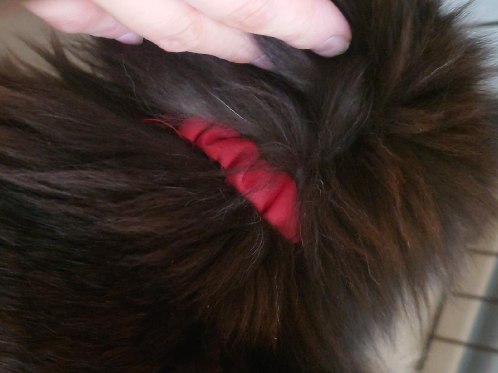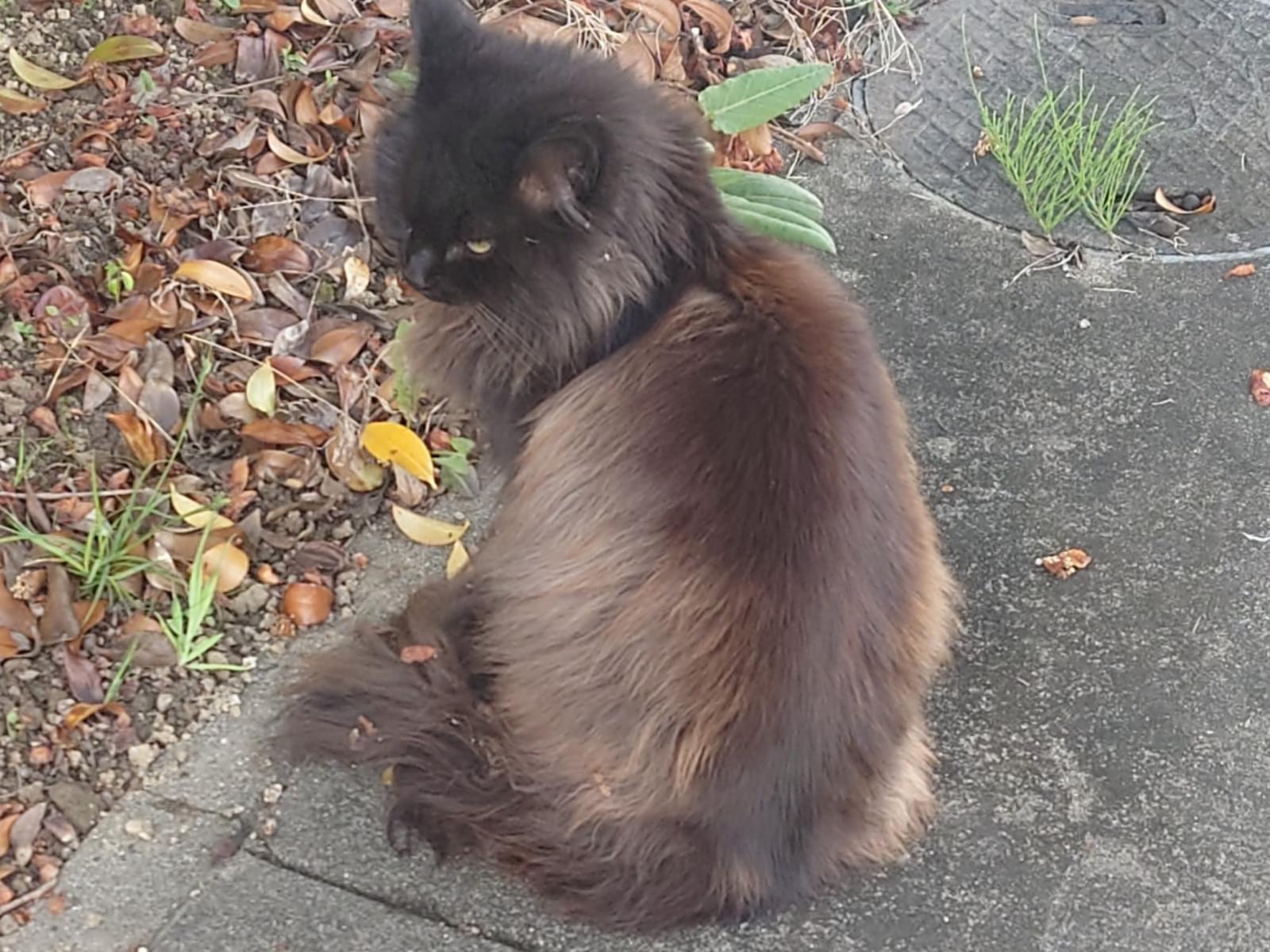 目は黄色で長毛。黒っぽい、焦げ茶色っぽい色をしていて、胴体は比較的薄めです。赤いゴムタイプ(細めのシュシュみたいな)首輪に花柄の鈴が付いています。ただマイクロチップはなかったです。