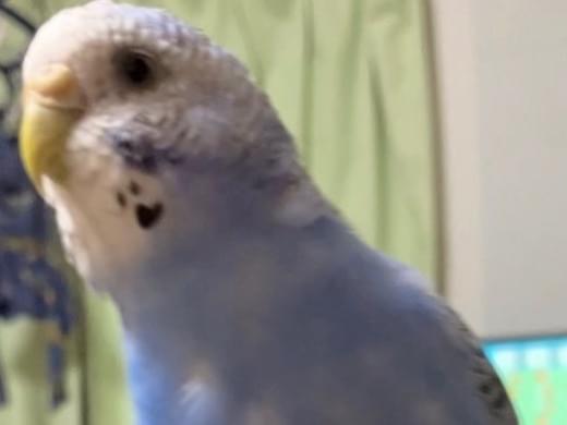 まだ生まれて一年経ってない鳥です。 頬の柄が黒でハートの形をしてます。ぴぃちゃん、口笛に反応します。手のりインコです。肩にも乗ります。